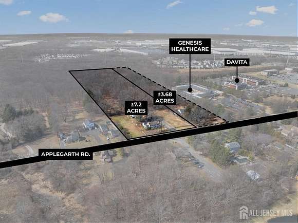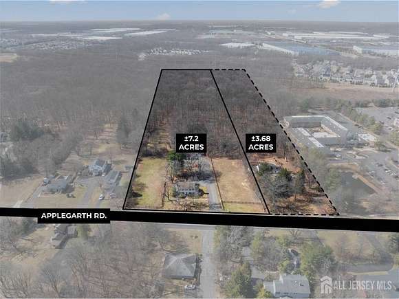 FOR SALE: 7.2 Acres of Land on Applegarth Rd. This commercial property is located in a highly sought after section of Monroe Township, just minutes from Forsgate Drive, the NJTP Exit 8A, and expansive residential communities such as Clearbrook, Rossmoor and Concordia. The property is Zoned: PO/CD (Planned Office Commercial District). This zoning allows a range or permitted uses such as: Professional Office Related Uses Such As: Corporate Centers, Data Processing Facilities, Computer Centers, Law and Accounting Offices, Research Offices, etc. Medical Uses: Doctors Offices like Family Practice, Urgent Care, Nephrology, Cardiology, Podiatry, Spine and Wellness, Physical Therapy, Orthopedics, General Dentistry, Orthodontist, Adult Daycare, Special Needs Day Program, Counseling and Therapy, etc. Retail Uses: Restaurants, Banquet Halls, Pharmacies, Banks or Financial Institutions. Sports and Health Facilities: Tennis Centers, Racquetball Centers, Health Spa, Swim School, Training Facility, etc. The prime location makes it ideal for any Medical Group looking to build their own building and establish a practice in a desirable location in Monroe Township. Also ideal for any buyer looking to build and open a restaurant and banquet hall. Finally, it is ideal for a multi-use sports and recreation facility. The adjacent 3.68 Acre property is also for sale which can be added for an additional 150' of frontage, bringing the total frontage to 450'. Please see https://www.loopnet.com/Listing/288-Applegarth-Rd-Monroe-Township-NJ/33828499/ The total acerage of the two parcels together is: 10.88 Acres. Real Estate Taxes: $11,719 per year Property is 300'x1,044' Property has City Water and Gas. Sewer available at the Street. Currently Improved with a Commercial Office Building, A Smaller Office Building and a Separate Garage/ Barn with parking lot. (Please arrange appointment in advance to visit the property) Please call Broker for more information.
