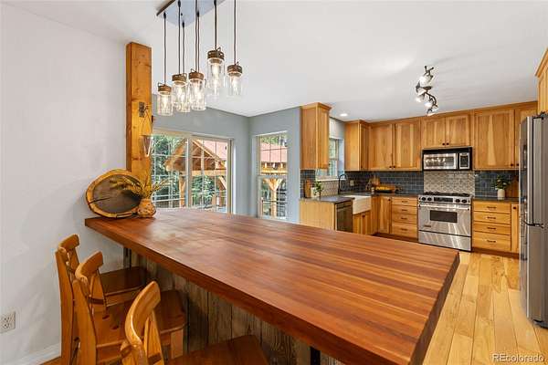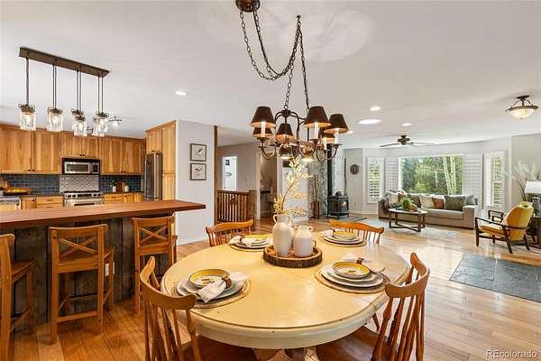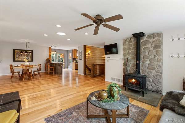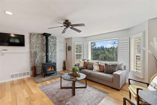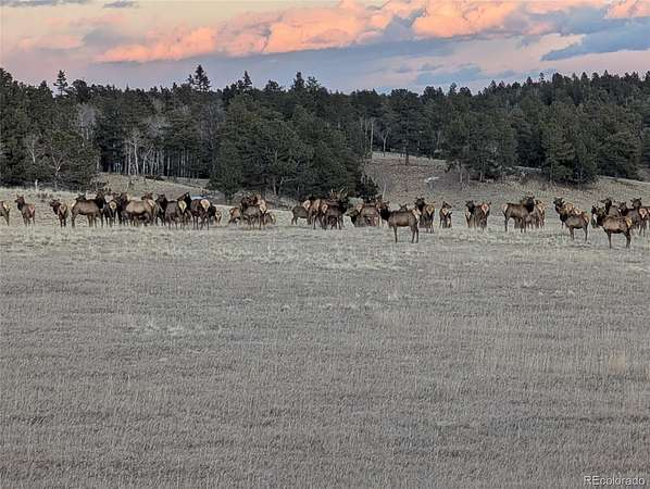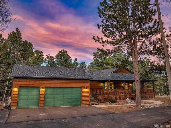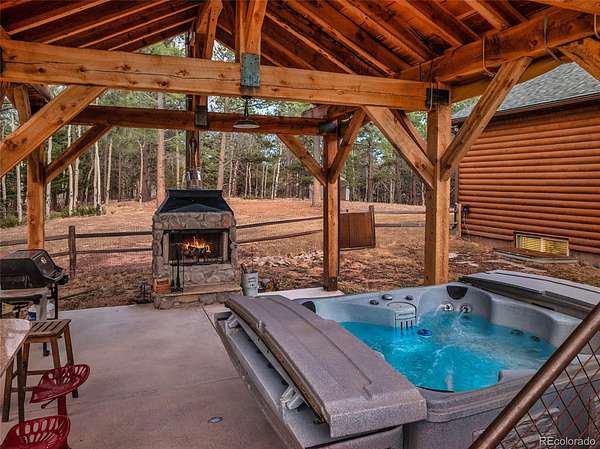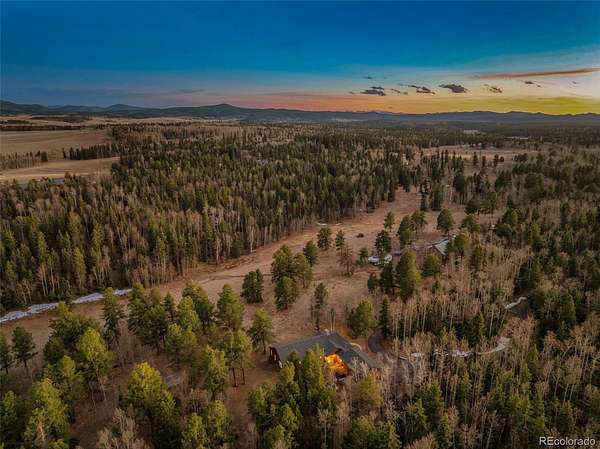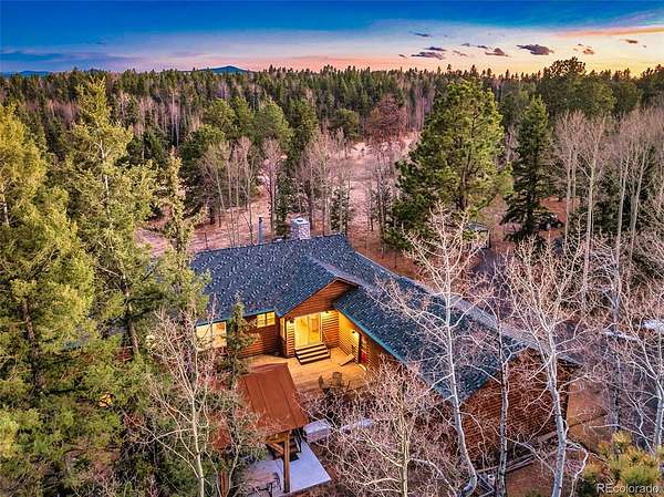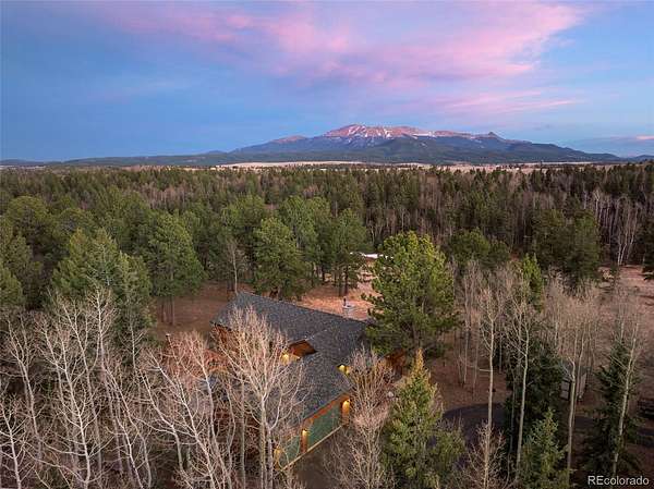 Private, hugely desirable 8.5 acre mountain preserve on an idyllic setting of aspen trees, views of Pikes Peak, usable acreage w/ a blacktop driveway! Rustic 4,540 sqft mountain home completely remodeled covered front deck, w/ new features including: New class 4 composite roof; Hickory hardwood flooring on the main level; custom plantation blinds throughout; new Hickory cabinetry and granite countertops + butcher block island, farm sink & new stainless steel appliances. Living area features a Jotul wood-burning stove, views overlooking Pikes Peak to the Southeast; main level laundry along w/ a Butler pantry; dog shower & a large doggie door; Main level owners suite also includes Hickory flooring, adjacent the remodeled primary bathroom w/ double vanity, jetted tub, a walk-in steam shower w/ dual shower heads, + a walk-in closet. 3 additional main level bedrooms w/ new carpeting, in addition to a remodeled full bath. The lower level includes 9 ft. ceilings, a comfortable family room including a corner gas fireplace, adjacent an office space, in addition to a non-conforming bedroom. Wonderful unfinished storage area/exercise room w/ rock climbing walls, also equipped with a “safe” room/wine cellar. There is an expansive rear deck, great for entertaining, & freshly stained, adjacent a custom-built pavilion on a concrete pad w/ a freestanding fireplace & 6 person hot tub. Fenced in yard for pets too! Mechanical updates include a new furnace in 2023, all natural gas appliances. Wander the trail system on the property to find an insulated treehouse & riding track for the kids! Parcel has no covenants or HOA, & includes an excellent 4 gpm well! Located just 15 minutes from Woodland Park, & just 7 minutes to Divide! Also only 1.5 hours to ski areas, & local trout fishing is just 20-30 minutes away. Hiking trails into National Forest are accessed across the street, as well as through a shortcut off the rear of the property. Located in the heart of recreational playgrounds!