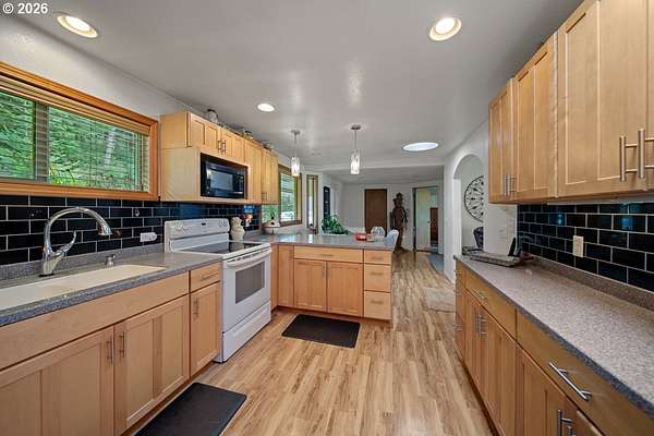 Tucked into a scenic Hunter Creek setting, this 3 bed, 2 full bath home sits on 1.65 acres within city limits while offering a true country feel. Just a short drive to town, the property provides privacy, open space, & a natural backdrop that's increasingly hard to find. Beyond the surveyed boundary lies additional county-owned creek frontage that has been maintained by the seller for decades for fire prevention & park-like enjoyment, creating an expansive setting with access to swimming holes, rock hunting, & peaceful creek side surroundings. In 2013, the home was taken down to the studs & extensively remodeled, with the exception of 1 bedroom that retains its original knotty pine built-ins while still benefiting from updated windows & overall system improvements. The remodel included new plumbing, new electrical, new windows, custom soft-close kitchen cabinetry with abundant storage, under-cabinet lighting, dimmable recessed lighting throughout most of the home, & 3 sun tunnel skylights that bring in beautiful natural light. Serviced by well water & septic, the property is thoughtfully equipped for flexibility & functionality. Fruit trees enhance the grounds, & there is RV parking with hookups. A seal-coated driveway in front & along the side of the home provides durability, & dual driveway access allows you to drive around the oversized metal shop for convenient pull-through capability. The shop features electricity, extra-large sliding doors tall enough to accommodate substantial equipment or recreational vehicles, an attached lean-to/carport, & an air compressor that will remain. Additional highlights include a garden shed with electricity & nearby water access, multiple exterior water spigots, extensive outdoor lighting, & a covered front porch finished with Trex decking. Buyer to verify property boundaries & ownership of adjacent land. Listing Broker is related to Seller. Sale is contingent upon Seller's successful closing of replacement property.