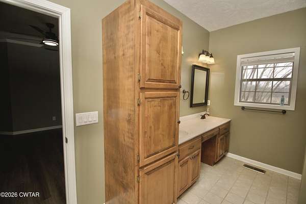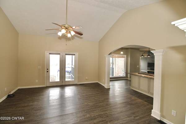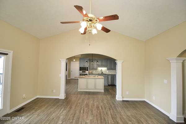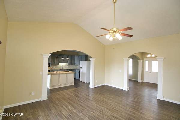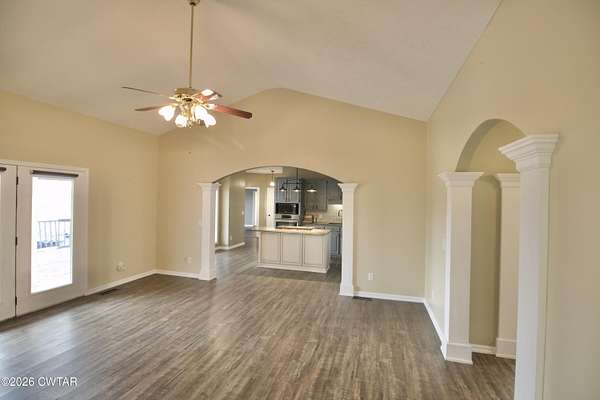 - Ceiling Fan(s), Double Vanity, Eat-In Kitchen, Entrance Foyer, Fiber Glass Shower, High Ceilings, Open Floorplan, Primary Downstairs, Vaulted Ceiling(s), Walk-In Closet(s)