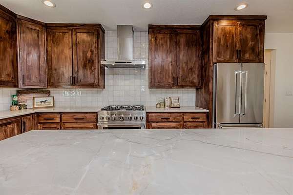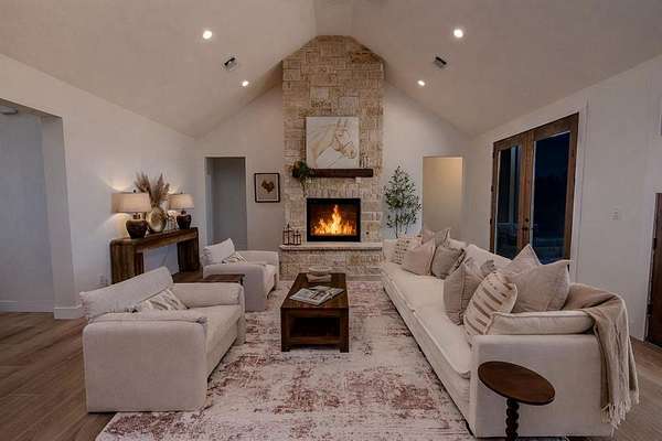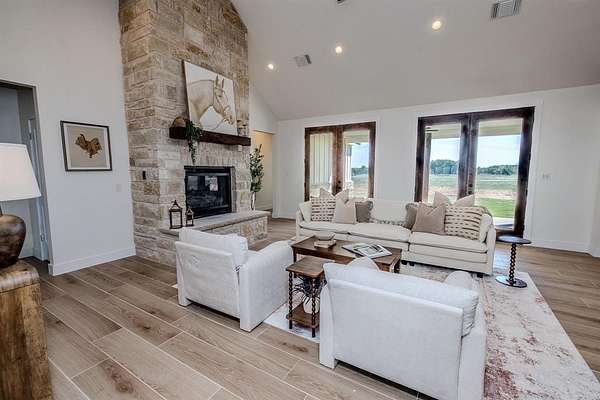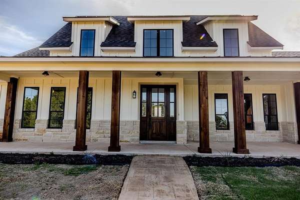 Almost finished and ready for YOU! This newly constructed single story 4 bedroom, 3.5 bathroom home features an open floor plan with a vaulted ceiling, separate wings for guest rooms and the primary suite, an office or bonus room off the wide entry foyer, and just feels so inviting and comfy! Thoughtful placement of the home on the three acre lot allows for sunrise and sunset enjoyment from the front or back covered patios. The garage is situated on the side of the house and there is plenty of room for having guests who can park in the spacious driveway. Extra features include slide selector color changing lighting - hard line stub out for a gas grill on the patio - 30 amp, 220v plug for an RV, car charger or welder in the garage. Nestled at the far back edge of The Hills Above Possum Kingdom, and set back from the road, it is slightly secluded with limited traffic and no neighbors building behind this property. To see the details and finish out on this modern country-style home, schedule your showing soon!