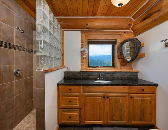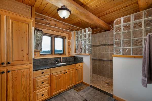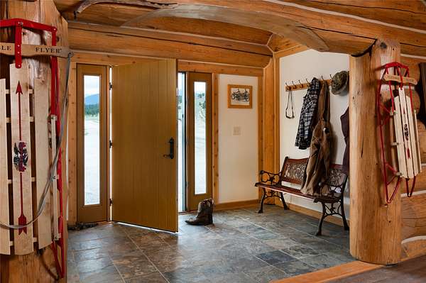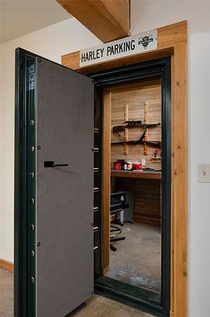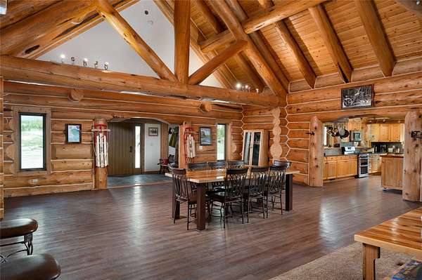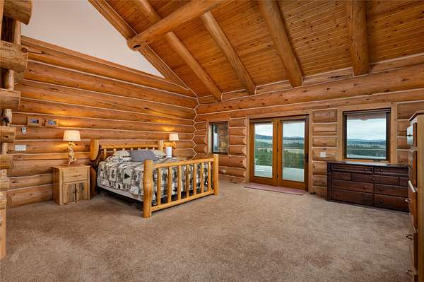 The authentic, custom log home features flexible living spaces ideal for multiple households: a primary suite, lofts, a convertible 3-bedroom walk-out apartment (perfect for in-laws or staff), and a private guest apartment above the oversized 6-car garage. Highlights include a secure gun safe room/wine cellar.