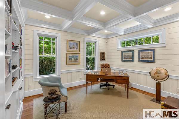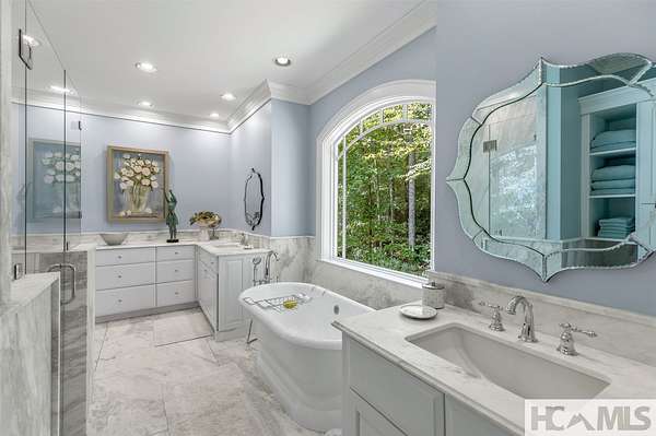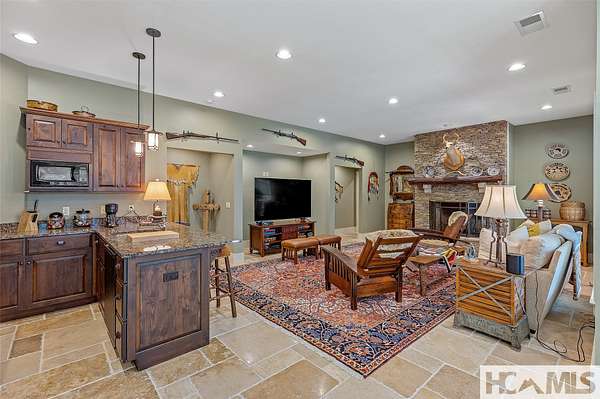 - Bar, Beamed Ceilings, Breakfast Bar, Built In Features, Cathedral Ceilings, Crown Molding, Double Vanity, Eat In Kitchen, Entrance Foyer, High Ceilings, Kitchen Island, Soaking Tub, Stone Counters, Walk In Closets, Wet Bar