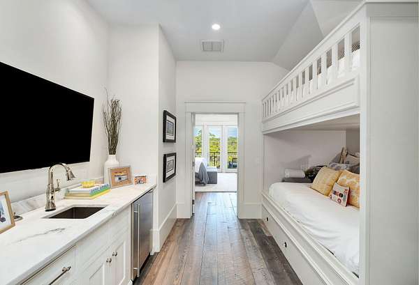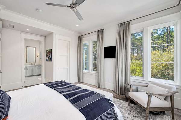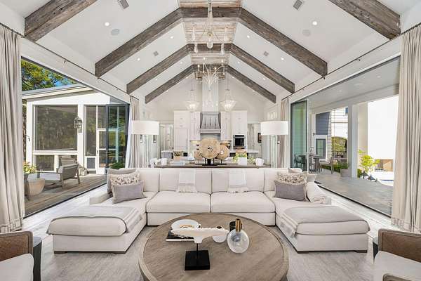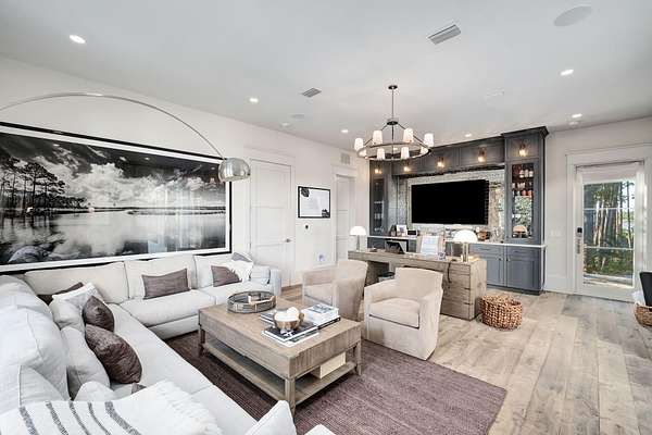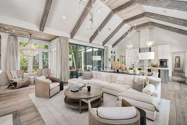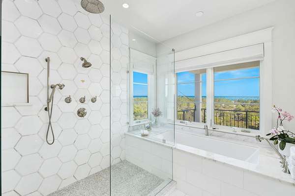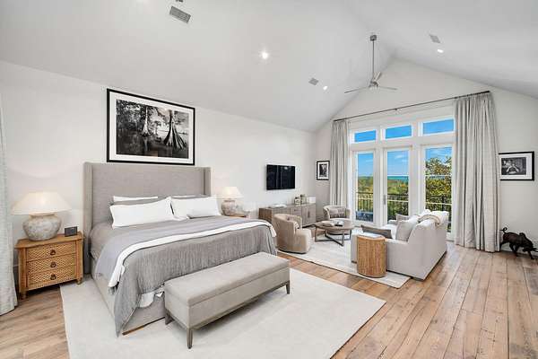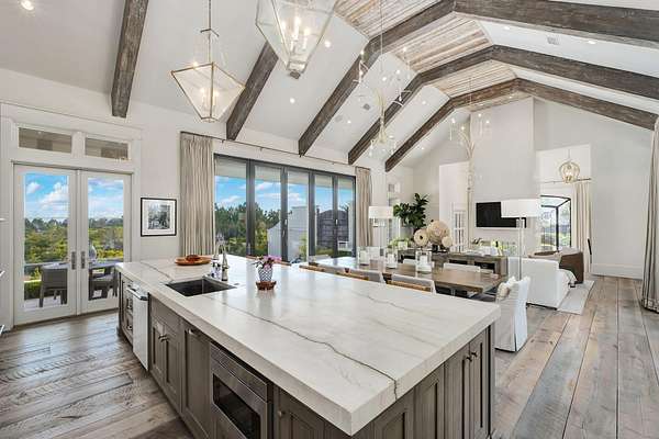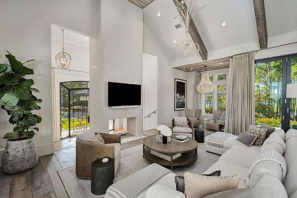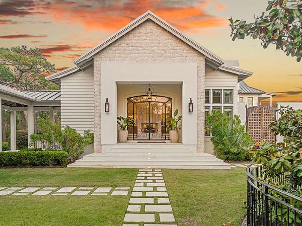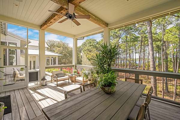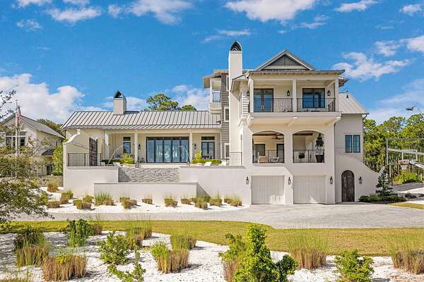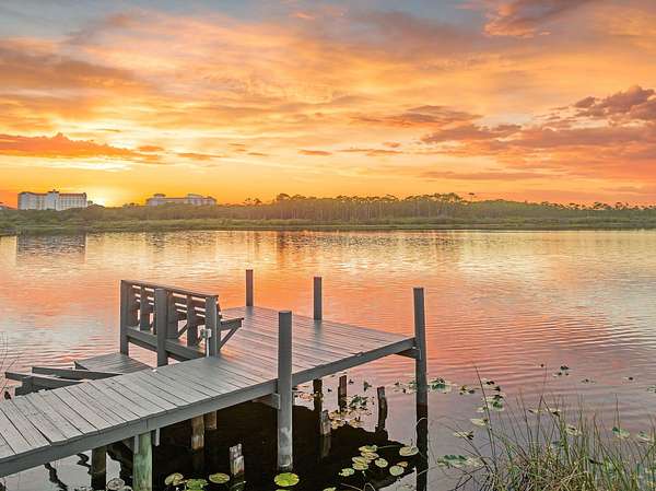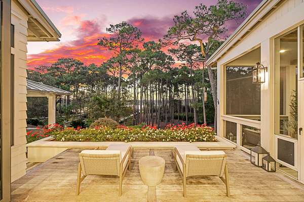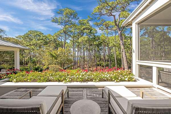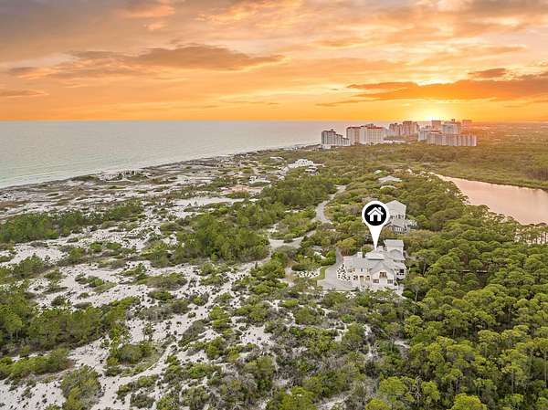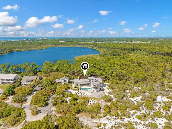 Tucked within the private, gated sanctuary of Four Mile Village, 285 Twisted Pine Trail presents an extraordinary opportunity to experience coastal living at its most serene and refined. Set on nearly three acres and bordered by the unspoiled beauty of Topsail Hill Preserve State Park, this remarkable estate offers a rare sense of privacy, where native wildlife and natural landscapes take center stage. From the moment you arrive, the canopy-lined drive evokes a sense of 'Old Florida,' a peaceful retreat far removed from the pace of everyday life. One of the property's most exceptional features is its dual frontage, capturing both coastal dune lake and gulf views. Coastal dune lakes are among the rarest natural phenomena in the world, found in only a handful of locations globally... and this home enjoys sweeping vistas of Fuller Lake to the north and the gulf to the south. Thoughtfully designed by Geoff Chick, the home blends timeless architecture with exceptional craftsmanship. Inside, curated details abound, from handcrafted lighting imported from Murano, Italy, to rich, rough-hewn cypress flooring that grounds the space in warmth and character. The expansive open-concept living and dining area is anchored by soaring vaulted ceilings, exposed beams, and a striking double-sided fireplace, all framed by walls of glass that capture panoramic water views. The gourmet kitchen is both functional and elegant, featuring an oversized quartzite island, a full suite of Thermador appliances, and additional support spaces including a butler's kitchen, wet bar, and wine cellar, perfect for effortless entertaining. Retractable European doors seamlessly connect the indoors to multiple outdoor living areas, where covered porches, open-air decks, and an infinity-edge pool and spa create a resort-style setting overlooking the dunes and emerald waters beyond. Each bedroom suite is designed as a private retreat, offering either lake or gulf views and uniquely crafted en-suite baths with custom tilework. The primary suite is a standout, complete with its own fireplace, private balcony, and a spa-inspired bath where both the soaking tub and shower overlook the gulf. Additional features include a third-level bunk room with a morning bar and a private elevator servicing all levels of the home. A detached carriage house enhances the property with a first-level game room, wet bar, and golf cart garage, while the upper level provides a bright guest space with built-in bunks, a full bath, and sweeping views. Nearly 300 feet of lake frontage and a private dock further elevate the outdoor experience, offering direct access to one of the area's rare coastal dune lakes. As part of Four Mile Village, residents enjoy access to over 230 acres of preserved coastal woodlands, a 40-acre dune lake, and more than 2,000 feet of private Gulf shoreline. Rich in both natural beauty and history, this one-of-a-kind property captures the essence of Northwest Florida's most treasured coastline, where luxury and untouched landscape exist in perfect harmony.