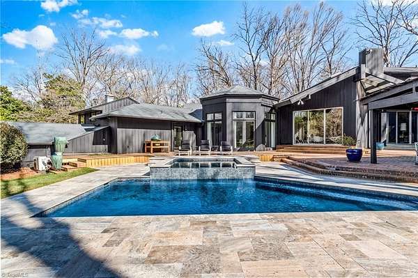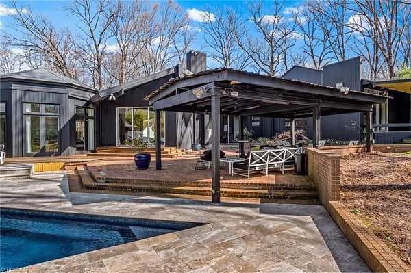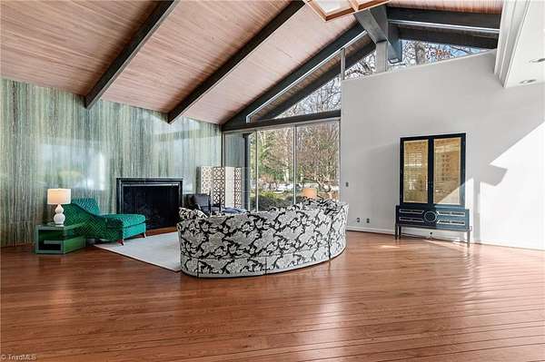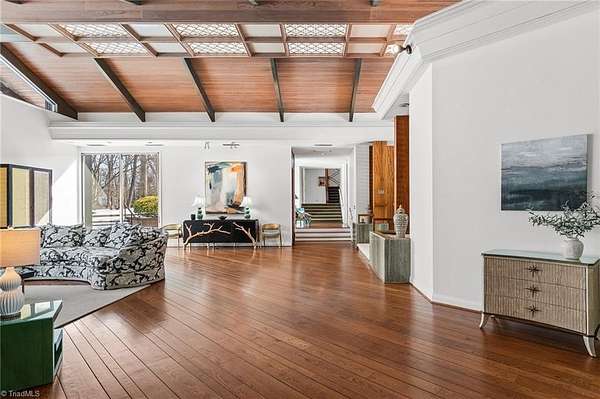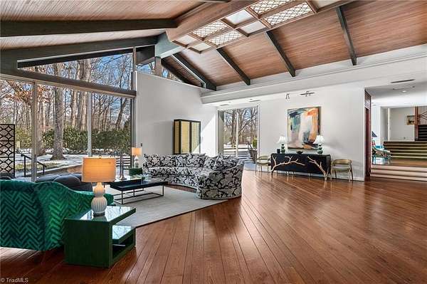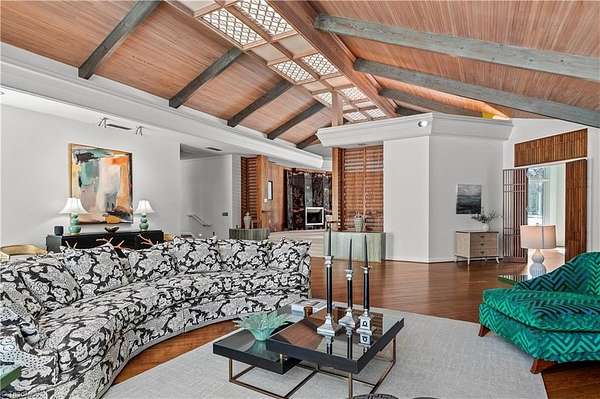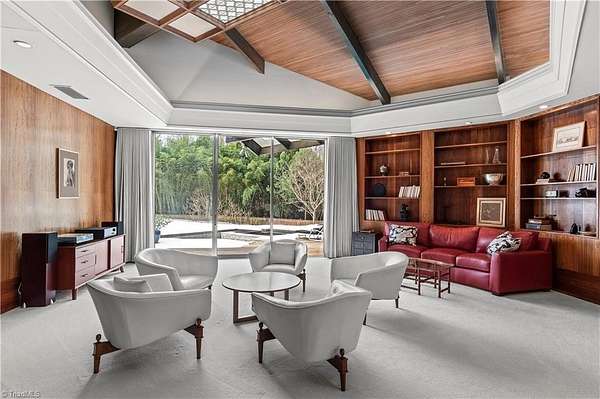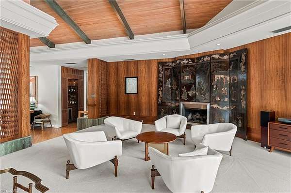 Magnificent mid-century marvel, custom built in 1964 for the prominent Albert Butler family. Natural materials of marble and intricate mahogany and cypress wood accents, this contemporary gem is highlighted by soaring ceilings and an open floor plan, perfect for today's lifestyle for comfortable yet stunning ambiance! The extraordinary NEW travertine pool is breathtaking, highlighted by the multilevel covered terraces w/ NEW outdoor heaters for year-round pleasure. Exquisite Swedish green marble Living Rm FP wall sets the scene for flowing access throughout from the LR to the octagonal Dining Rm! Original Coromandal Oriental screen holds court in the inviting Library; gourmet kitchen reflects the contemporary flair w/ over-the-top appliances! ML Primary Suite w/ 2 en-suite baths plus glorious views of the grounds. Nestled on just over 2 acres with 4 en-suite BR suites, floor to ceiling window walls, capturing sun dappled trees, provide a stunning home beyond imagination! A MASTERPIECE!