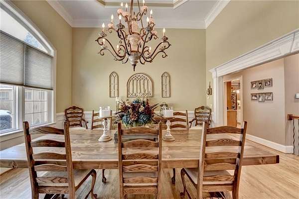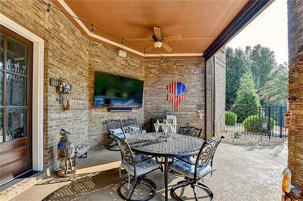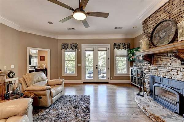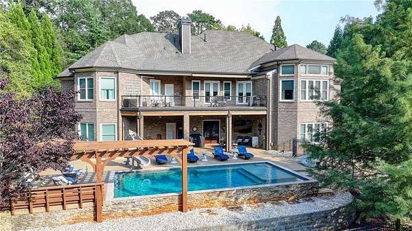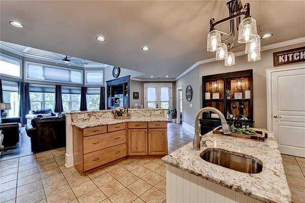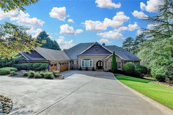 Rare four-sided brick, custom-built ranch situated on 2.38 acres on a community with no HOA and backing up to a private lake. This exceptional home offers a resort-style outdoor living experience, featuring a rectangular saltwater pool with a built-in Badujet Super-Sport II swim jet system, a tanning ledge and slide, a large stone fireplace beneath a pergola-covered sitting area, and a backyard fire pit perfect for stargazing and enjoying the peaceful lake views. (Property extends to the opposite side of the lake.) Additional exterior highlights include a four-car garage configuration, a three-car garage, a two-car pull-through, plus an additional rear garage for extra storage or workshop space. Step through the double front doors into a welcoming foyer, flanked by a spacious dining room on the left and a large executive office on the right. Toward the back of the home, you'll find one of two full kitchens this property offers. The gourmet kitchen features 2023 Viking appliances, a wall oven with convection oven/microwave, warming drawer, five-burner cooktop, faux-brick backsplash, large breakfast bar with seating for four, granite countertops, tile flooring, two sinks, a center island, and a walk-in pantry. The large family room impresses with soaring cathedral ceilings, a bay window, oversized ceiling fan, and custom built-ins. The owner's suite on the main level includes private deck access and a custom walk-in closet with its own laundry area. The spa-like primary bathroom features a jetted tub and a spacious walk-in shower. The terrace level offers ten-foot ceilings and eight-foot doors, creating an open and luxurious feel. This level includes a full second kitchen with a breakfast bar, stainless steel appliances, and a walk-in pantry. You'll also find an exercise room, media room, sauna, and two additional bedrooms with 1.5 baths. Step outside from the terrace level to a covered porch, perfect for grilling, entertaining, and enjoying views of the pool and lake. Owners paid $15K to run Comcast down the street to get business fiber to the house. This property has a stand-alone Generac Generator for peace of mind. Properties like this rarely come on the market, and when they do, they move fast.