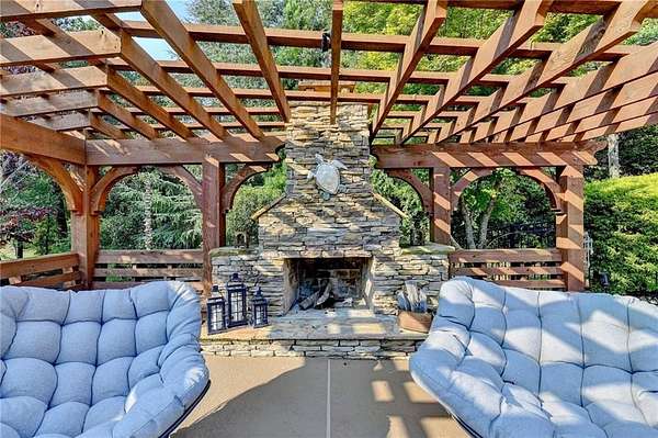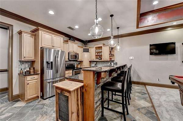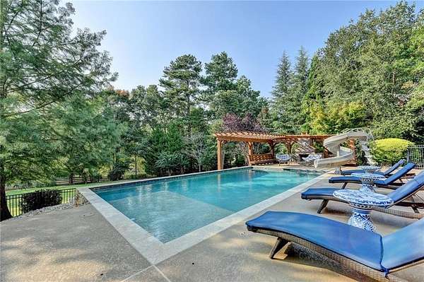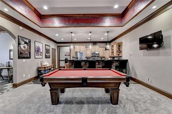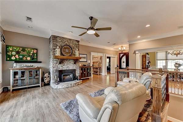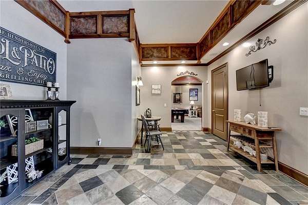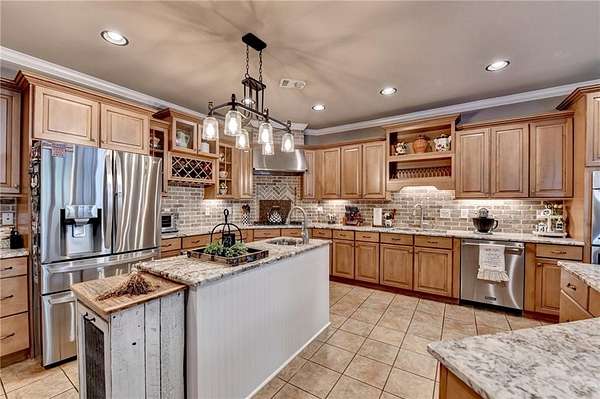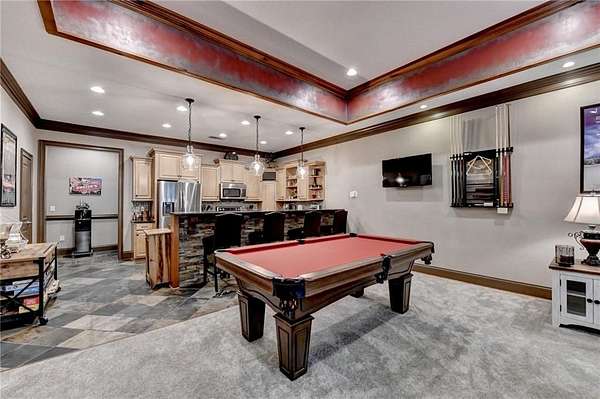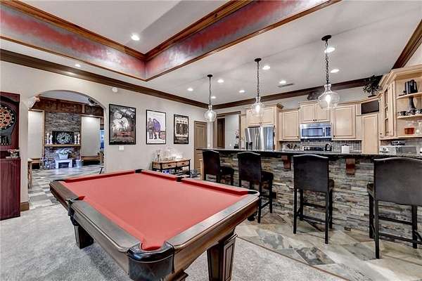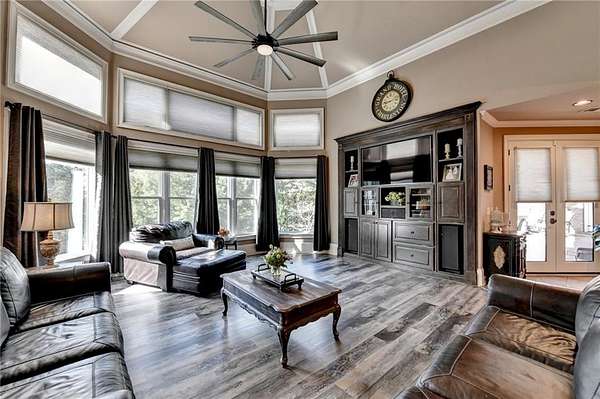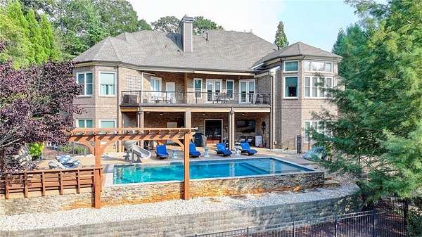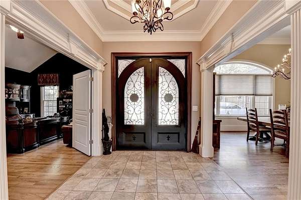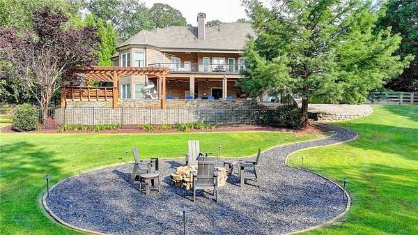 Welcome to a private lakefront estate where timeless elegance meets resort-style living, set on 2.38 pristine acres in a serene, no-HOA setting designed for those who value both freedom and distinction. From the moment you arrive, this exceptional property offers a rare combination of privacy, scale, and lifestyle. Perfectly positioned along a private, fully stocked pond, with ownership extending to the opposite side, this estate delivers a sense of seclusion that feels worlds away, yet remains conveniently close to everything. The outdoor living experience is nothing short of extraordinary. Designed to rival a luxury retreat, the backyard showcases a stunning rectangular saltwater pool featuring a Badujet Super-Sport II swim jet system, a tanning ledge, and a slide. The pool is both heated and equipped with a cooling feature, allowing for year-round enjoyment. Beneath the pergola-covered lounge, a grand stone fireplace creates an inviting gathering space, while a fire pit overlooking the water sets the stage for unforgettable nights under the stars. Every detail has been thoughtfully curated for both entertaining and quiet enjoyment. For the car enthusiast or those seeking flexibility, the property offers a rare four-car garage configuration, including a three-car garage, a two-car pull-through, and an additional rear garage, ideal for a collector's showcase or workshop. Inside, the home welcomes you with understated sophistication. Double front doors open to a gracious foyer, flanked by a formal dining room and a spacious executive office. The layout blends open-concept living with well-defined spaces for both entertaining and everyday living. At the heart of the home lies a chef's kitchen appointed with premium 2023 Viking appliances, including a convection wall oven/microwave, warming drawer, and an upgraded six-burner cooktop. Granite countertops, dual sinks, a large island, and a walk-in pantry enhance both function and style. The kitchen flows seamlessly into the dramatic family room, where soaring cathedral ceilings, custom built-ins, and expansive windows create a bright and inviting space. The main-level owner's suite offers a true retreat, complete with private deck access overlooking the peaceful landscape and water. A custom walk-in closet with its own laundry area adds convenience, while the spa-inspired bath features a jetted soaking tub and oversized shower. The terrace level continues the home's story of comfort and versatility, featuring 10-foot ceilings and 8-foot doors. A second kitchen, media room, fitness room, sauna, and two bedrooms with 1.5 baths create a private retreat within the home. Power sunscreens enhance comfort and efficiency. Step outside to the covered terrace, where indoor and outdoor living blend seamlessly, offering serene pool and pond views. Modern enhancements include business-class fiber internet and a stand-alone Generac generator for uninterrupted comfort. A property of this caliber, offering acreage, private waterfront access, resort-style amenities, and exceptional privacy, is a rare opportunity. Homes like this are not just purchased; they are experienced, and seldom available for long.
