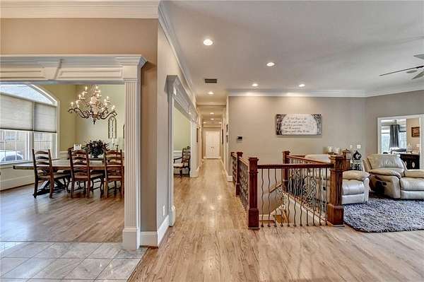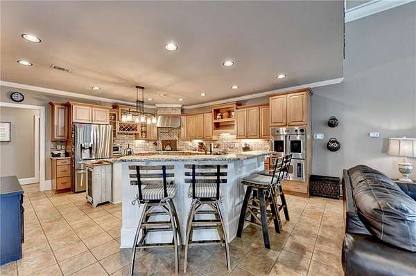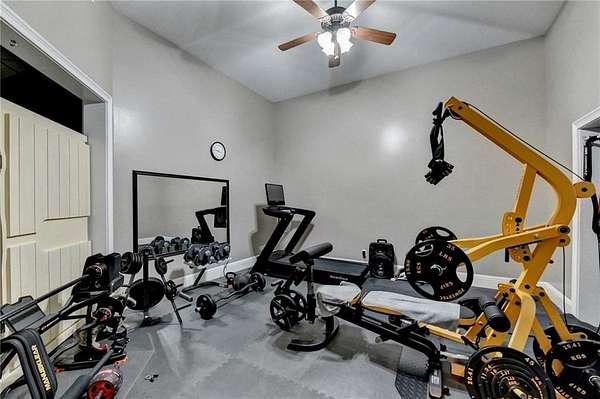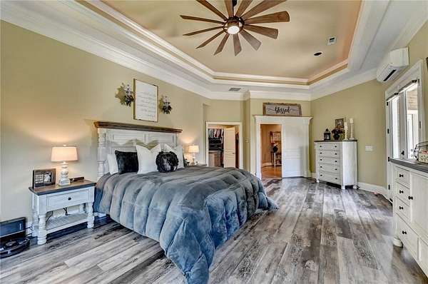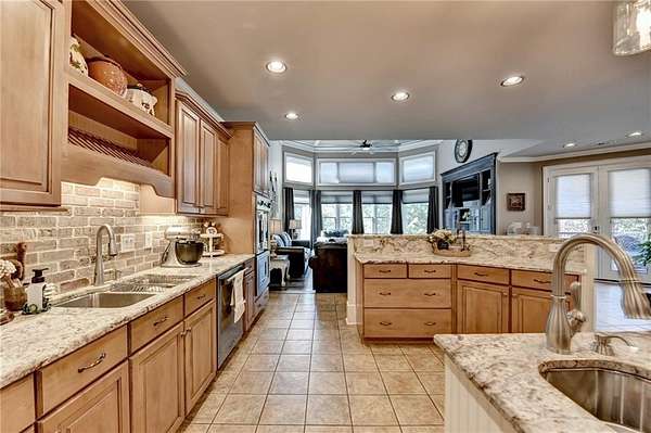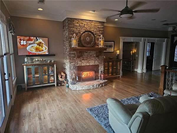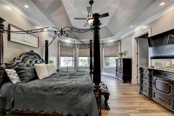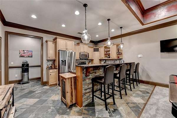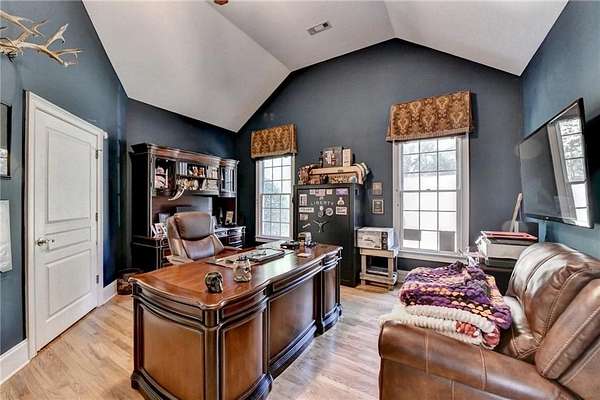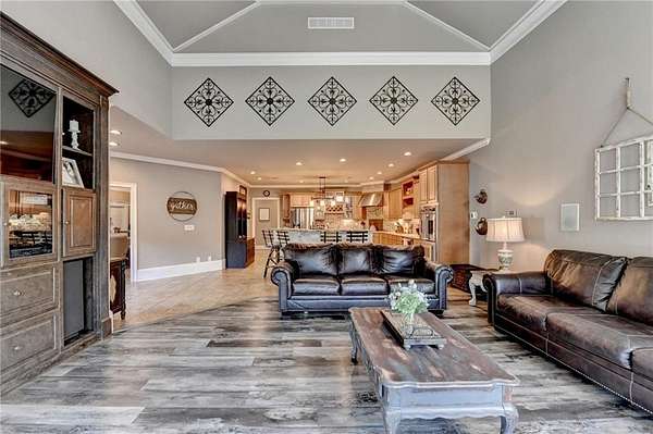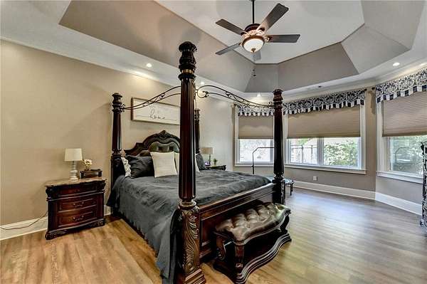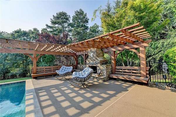 Welcome to a private lakefront estate where timeless elegance meets resort-style living, set on 2.38 pristine acres in a serene, no-HOA setting designed for those who value both freedom and distinction. From the moment you arrive, this exceptional property offers a rare combination of privacy, scale, and lifestyle. Perfectly positioned along a private, fully stocked pond, with ownership extending to the opposite side, this estate delivers a sense of seclusion that feels worlds away, yet remains conveniently close to everything. The outdoor living experience is nothing short of extraordinary. Designed to rival a luxury retreat, the backyard showcases a stunning rectangular saltwater pool featuring a Badujet Super-Sport II swim jet system, a tanning ledge, and a slide. The pool is both heated and equipped with a cooling feature, allowing for year-round enjoyment. Beneath the pergola-covered lounge, a grand stone fireplace creates an inviting gathering space, while a fire pit overlooking the water sets the stage for unforgettable nights under the stars. Every detail has been thoughtfully curated for both entertaining and quiet enjoyment. For the car enthusiast or those seeking flexibility, the property offers a rare four-car garage configuration, including a three-car garage, a two-car pull-through, and an additional rear garage, ideal for a collector's showcase or workshop. Inside, the home welcomes you with understated sophistication. Double front doors open to a gracious foyer, flanked by a formal dining room and a spacious executive office. The layout blends open-concept living with well-defined spaces for both entertaining and everyday living. At the heart of the home lies a chef's kitchen appointed with premium 2023 Viking appliances, including a convection wall oven/microwave, warming drawer, and an upgraded six-burner cooktop. Granite countertops, dual sinks, a large island, and a walk-in pantry enhance both function and style. The kitchen flows seamlessly into the dramatic family room, where soaring cathedral ceilings, custom built-ins, and expansive windows create a bright and inviting space. The main-level owner's suite offers a true retreat, complete with private deck access overlooking the peaceful landscape and water. A custom walk-in closet with its own laundry area adds convenience, while the spa-inspired bath features a jetted soaking tub and oversized shower. The terrace level continues the home's story of comfort and versatility, featuring 10-foot ceilings and 8-foot doors. A second kitchen, media room, fitness room, sauna, and two bedrooms with 1.5 baths create a private retreat within the home. Power sunscreens enhance comfort and efficiency. Step outside to the covered terrace, where indoor and outdoor living blend seamlessly, offering serene pool and pond views. Modern enhancements include business-class fiber internet and a stand-alone Generac generator for uninterrupted comfort. A property of this caliber, offering acreage, private waterfront access, resort-style amenities, and exceptional privacy, is a rare opportunity. Homes like this are not just purchased; they are experienced, and seldom available for long.