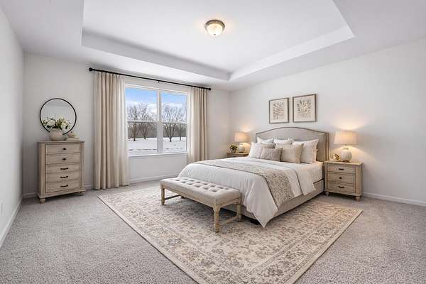 Ready for quick Occupancy! Ideal Scenic 2.24 acre parcel offers scenic wrap around pond views, rolling terrain and Western facing elevation. Interior features include a great room that opens to the kitchen and eat-in nook, study, mud room with a walk-in closet, laundry room, primary suite with a private full bath and walk-in closet, and two secondary bedrooms with a jack-and-jill bath and walk-in closets. Everything you need on one level. Cathedral ceilings accent the great room and a cozy fireplace is a perfect spot to finish your favorite book. The great room opens into the Chef's inspired kitchen with light coming in from all angles and featuring 42' upper cabinetry, quartz countertops, hardwood floors with a large central island. 3 car side entry garage, concrete driveway, full basement with bath prep. SEV and taxes currently set for vacant land. Sidewalk, porch cap and finish grade completed in Spring/Summer. House is under builders warranty through December 2026.