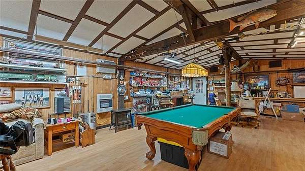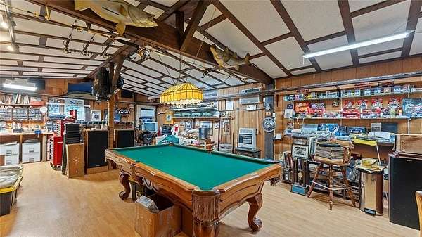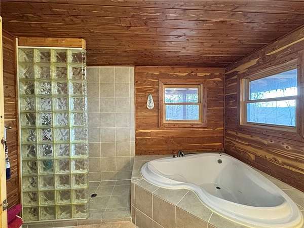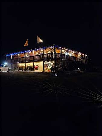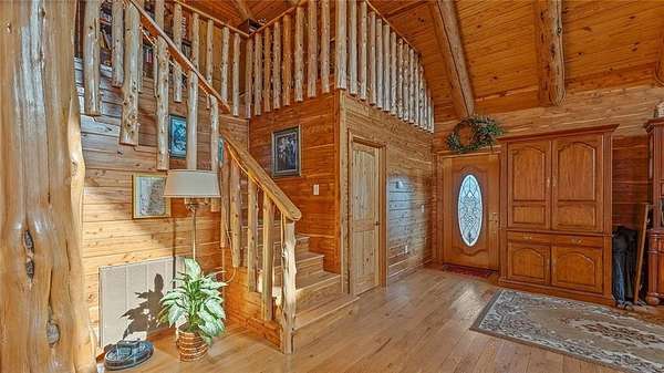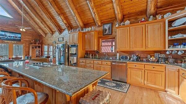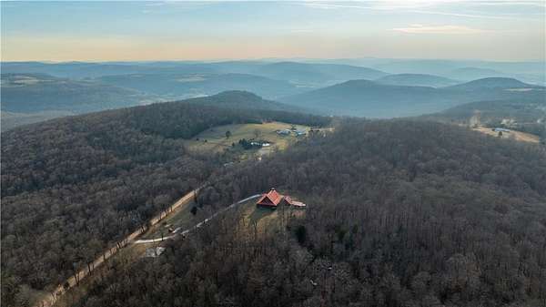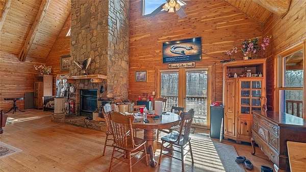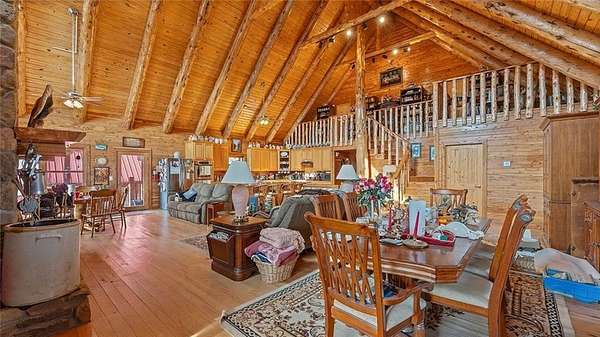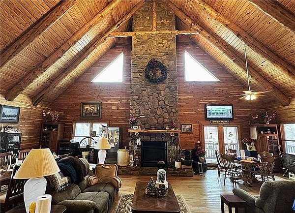 Exceptional 3-bedroom 2.5 bath Log Home with stunning Ozark Mountain views and quality craftsmanship throughout. Features soaring ceilings with Colorado timber rafters, pine wood ceilings, cedar accents, custom stone fireplace, and an open kitchen with a 4'x12' island. A dedicated office sits just off the kitchen and the primary suite includes a relaxing heart shaped double bathtub. Exterior highlights include 6" "D" style log construction and approximately 248'x8' of wrap around covered porch with hot tub. Outbuildings include a detached garage with loft and second washer & dryer connections, three bay carport attached to the 2 car garage, a 20'x30' workshop, 20'x40' heated/cooled man cave(pool table conveys), and an additional 20'x40' enclosed space. Property Boasts 76+/- acres of the Ozarks with mature trees and a pond.
