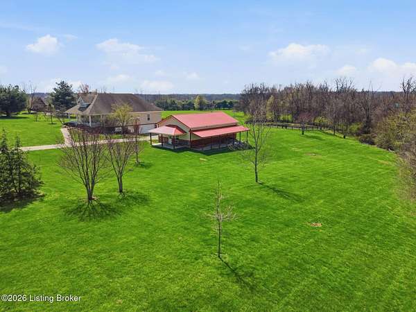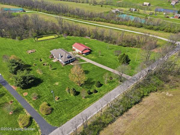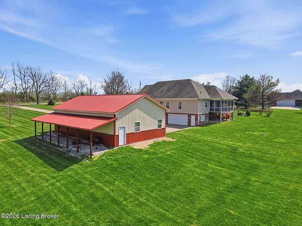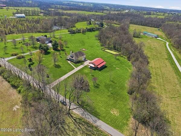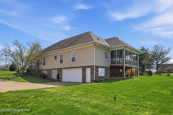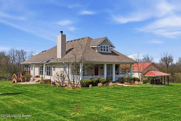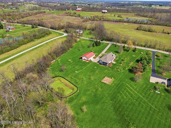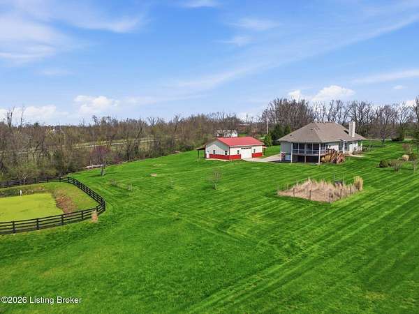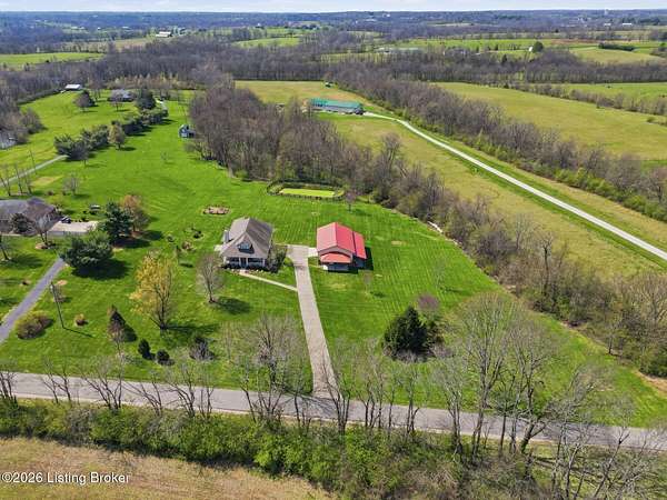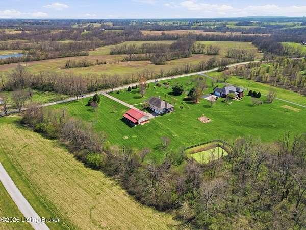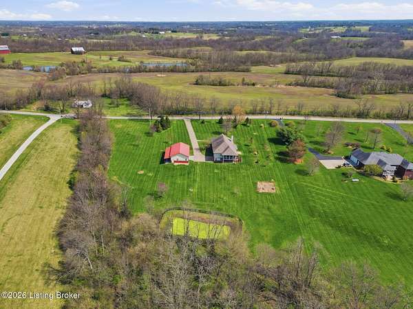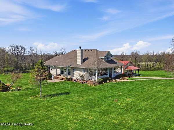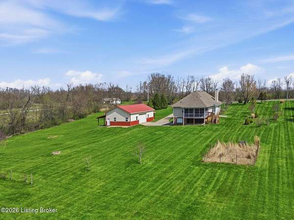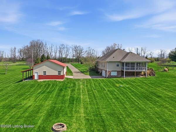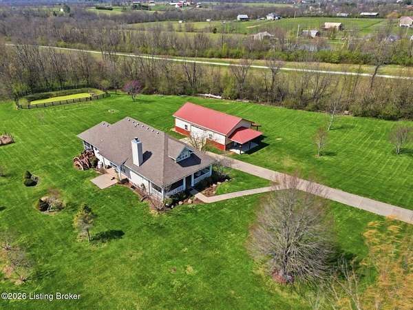 Energy-efficient custom-built home on 5 scenic acres in Shelbyville, KY, offering the perfect blend of privacy, comfort, and countryside charm. Enjoy a picturesque drive along Hebron Road surrounded by rolling green pastures and horse farms as you arrive at this exceptional property. Designed with both functionality and style in mind, this home features an open floor plan with a desirable first-floor primary suite and laundry. The main level boasts 10 foot ceilings and includes a spacious great room, formal dining room, well-appointed kitchen, an additional bedroom currently used as an office, and a second full bathroom. Beautiful plank hardwood flooring flows throughout the living, dining, and kitchen areas. The kitchen is a chef's dream with a large island, granite countertops, Barber cabinetry, stone backsplash, and top-of-the-line GE Profile appliances, including double wall ovens and a 6-burner gas stove. The great room showcases custom built-ins flanking a Vermont Castings wood-burning fireplace, creating a warm and inviting space. The dining room, measuring 15x16, features its own custom built-ins and elegant two-piece crown molding. Upstairs, you'll find a spacious bedroom with a private en-suite full bathroom-ideal as a second primary suite or guest retreat. Additional highlights include a WaterFurnace geothermal HVAC system for superior energy efficiency, Alcoa Structure insulated siding for low-maintenance living, and an attached 2-car garage. The basement is already framed and ready for your finishing touches. Outdoor living is just as impressive with a screened-in porch overlooking the backyard, a fenced-in garden, a 34x10 covered front porch, and a 30x50 pole barn built in 2012-perfect for storage, cars, or hobbies. A rare opportunity to own a thoughtfully designed home with modern efficiency in a peaceful, rural setting.