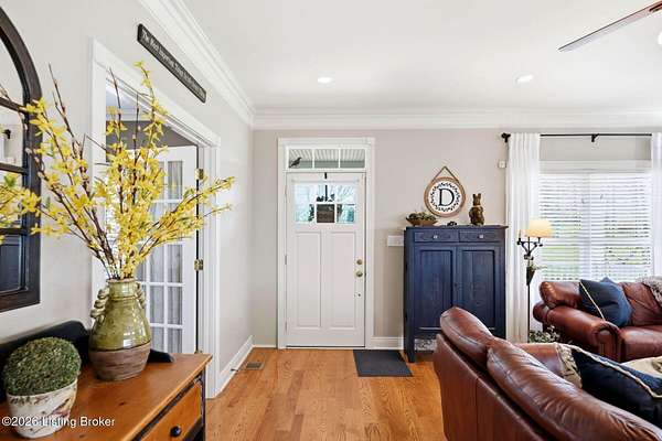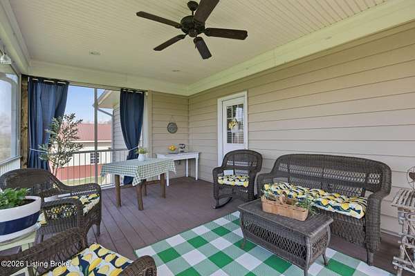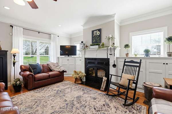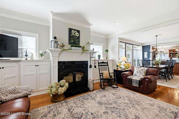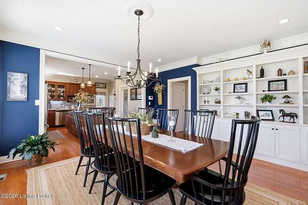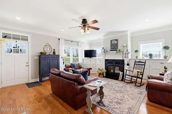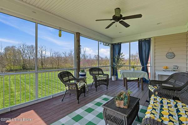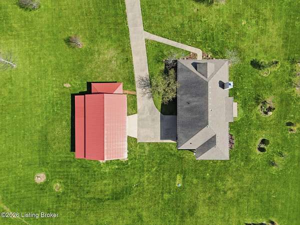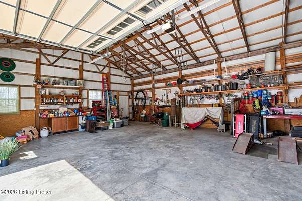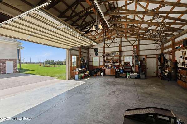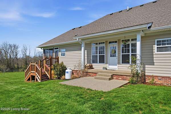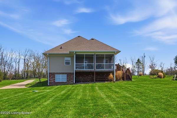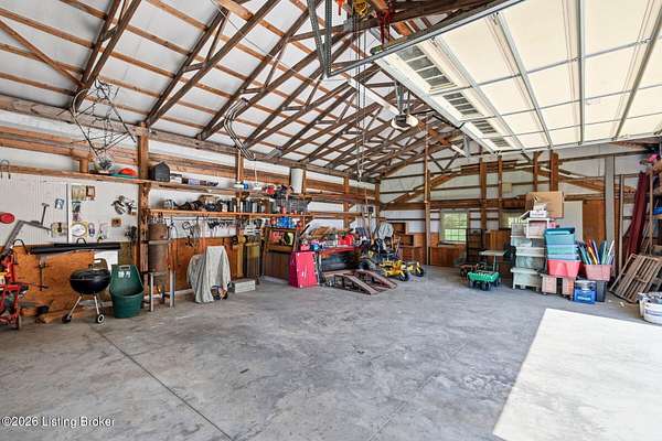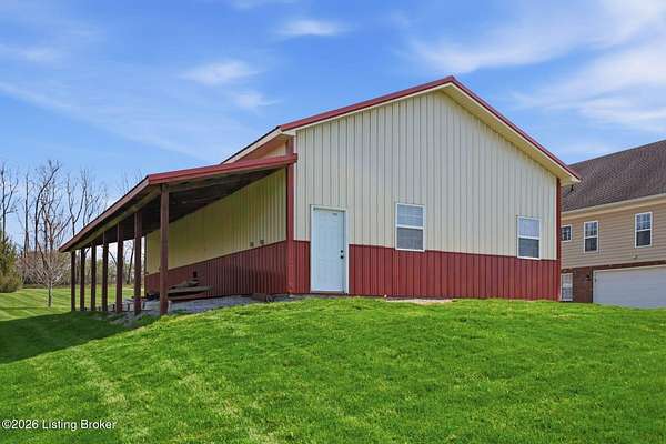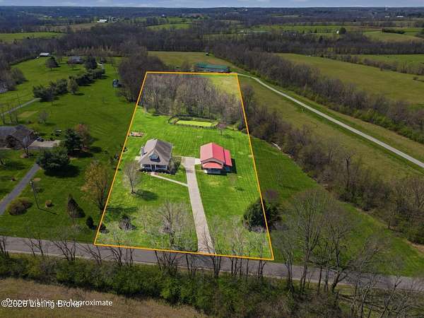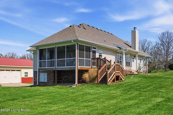 Energy-efficient custom-built home on 5 scenic acres in Shelbyville, KY, offering the perfect blend of privacy, comfort, and countryside charm. Enjoy a picturesque drive along Hebron Road surrounded by rolling green pastures and horse farms as you arrive at this exceptional property. Designed with both functionality and style in mind, this home features an open floor plan with a desirable first-floor primary suite and laundry. The main level boasts 10 foot ceilings and includes a spacious great room, formal dining room, well-appointed kitchen, an additional bedroom currently used as an office, and a second full bathroom. Beautiful plank hardwood flooring flows throughout the living, dining, and kitchen areas. The kitchen is a chef's dream with a large island, granite countertops, Barber cabinetry, stone backsplash, and top-of-the-line GE Profile appliances, including double wall ovens and a 6-burner gas stove. The great room showcases custom built-ins flanking a Vermont Castings wood-burning fireplace, creating a warm and inviting space. The dining room, measuring 15x16, features its own custom built-ins and elegant two-piece crown molding. Upstairs, you'll find a spacious bedroom with a private en-suite full bathroom-ideal as a second primary suite or guest retreat. Additional highlights include a WaterFurnace geothermal HVAC system for superior energy efficiency, Alcoa Structure insulated siding for low-maintenance living, and an attached 2-car garage. The basement is already framed and ready for your finishing touches. Outdoor living is just as impressive with a screened-in porch overlooking the backyard, a fenced-in garden, a 34x10 covered front porch, and a 30x50 pole barn built in 2012-perfect for storage, cars, or hobbies. A rare opportunity to own a thoughtfully designed home with modern efficiency in a peaceful, rural setting.
