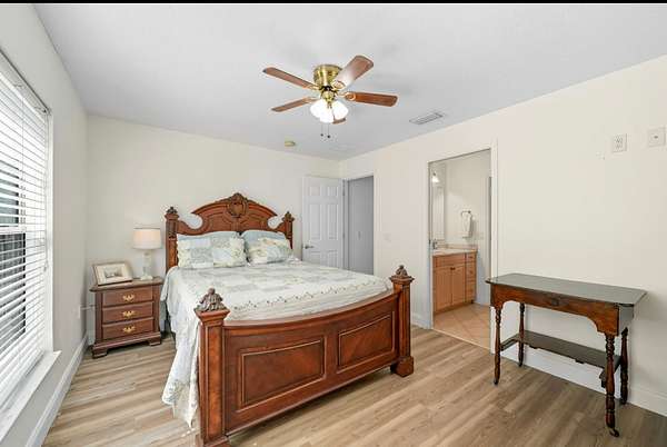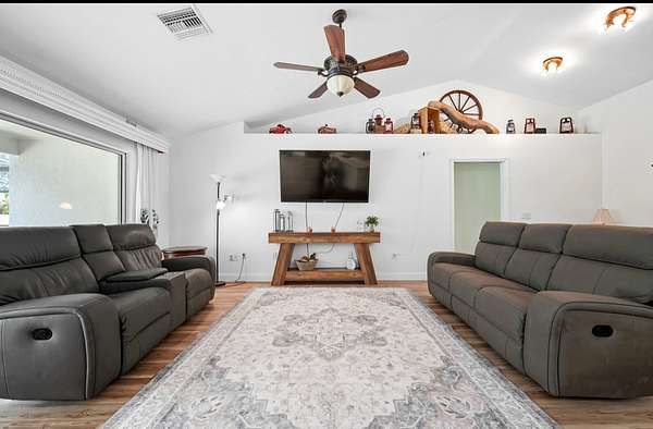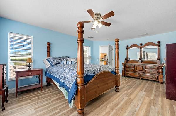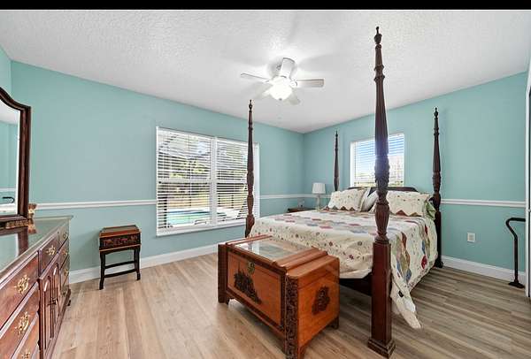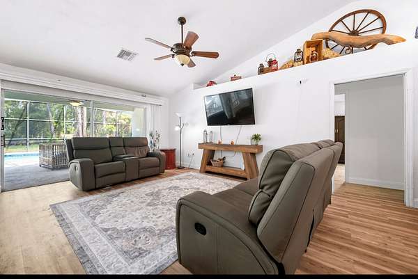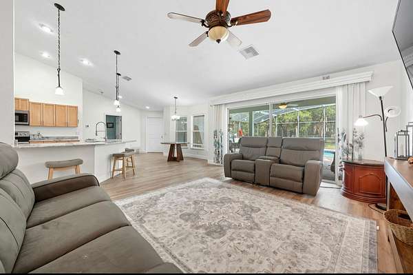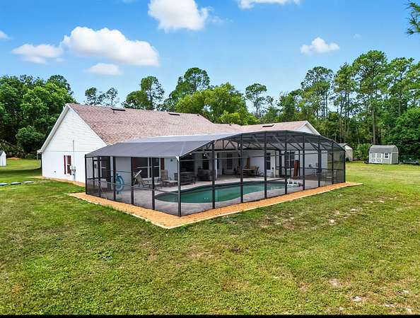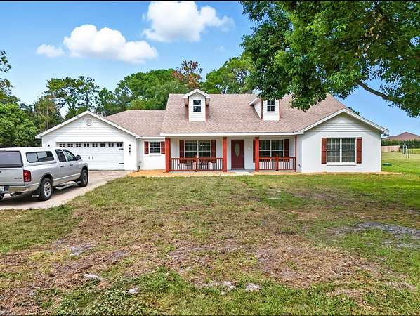 This beautifully completely fenced, remodeled and upgraded, TURN KEY (back bedroom set excluded) pool home offers privacy and contemporary living on more than five acres. Designed for both comfort and style, the residence features a screened-in pool and patio, a welcoming front porch, formal living and dining rooms, and a spacious great room that opens seamlessly to the pool area along with acreage of privacy. The large kitchen includes a new counter-height breakfast bar, new elegant granite countertops, and plenty of space for a breakfast nook--making it perfect for casual dining or entertaining. The bedroom layout is thoughtfully designed: two bedrooms share a convenient Jack-and-Jill bathroom, a third bedroom/mini suite offers its own private full bath. The primary suite has two walkin closets and provides a relaxing retreat with a garden tub, separate shower, and separate vanities and sinks. Recent improvements enhance both functionality and appeal. A new roof was installed in 2019, followed by a new AC unit in 2023, which comes with a 10-year warranty. The screen enclosure was replaced in 2024, and a comprehensive renovation was completed in 2025, which included new waterproof, laminate vinyl plank flooring throughout the home (while retaining tile in the kitchen and bathrooms), repainting the entire interior and exterior, and adding a new vanity in the back mini suite. All renovation work is covered by a transferrable one-year warranty. The kitchen was further upgraded in 2025 with the new breakfast bar, granite countertops, and a new dishwasher. Additional updates include a hot water heater in 2020, a garage door opener in 2025, new front porch banister and shutters in 2025, a new pool motor in 2025, and a new entry gate motor in 2024. Landscaping improvements were also completed in 2025, adding attractive rock features and fresh sod to areas of the property. The water and sewer system were enhanced in 2019, see attachment for explanation. With all of its contemporary updates, efficient floor plan, and over five acres of serene surroundings, this home is move-in ready and offers the perfect balance of style, comfort, and privacy.