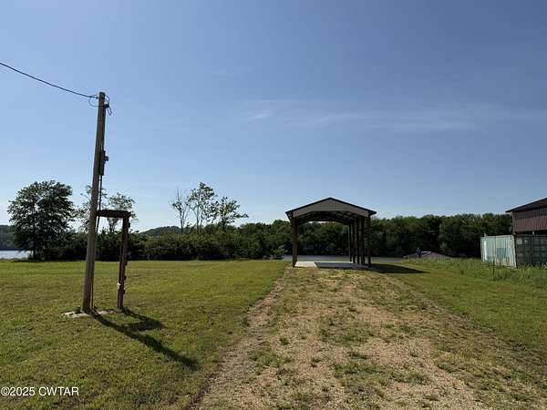 Riverfront lot in Paradise Landing, fully set up and ready for your camper with a concrete pad, pole barn-style cover, 50 & 30 amp electric, septic, and city water hookups. Fiber available. Enjoy stunning views of the Tennessee River, with rock bluffs and waterfalls directly across the water and vibrant river traffic like the American Splendor passing by. Located between Linden and Clifton, this property offers quick access to a community boat ramp and all your favorite water activities.