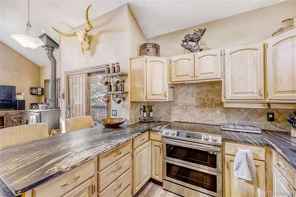 Inside, the home blends rustic charm with thoughtful upgrades. The inviting living room features a cozy wood-burning stove and luxury vinyl plank flooring, and flows seamlessly into the updated kitchen. Designed with both style and function in mind, the kitchen showcases striking granite countertops, a copper sink, stainless steel appliances, a tile backsplash, and a breakfast bar—all beneath vaulted ceilings filled with natural light. Newer Anderson windows throughout help improve energy efficiency while framing the surrounding scenery.