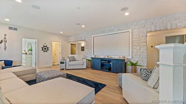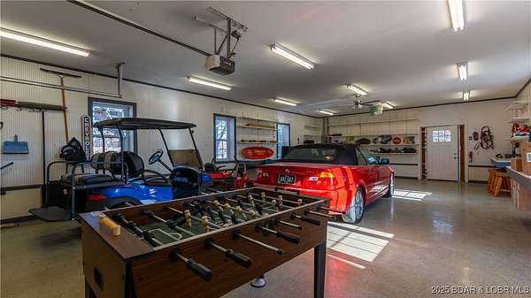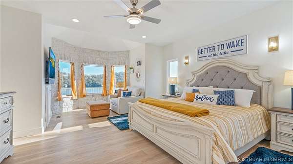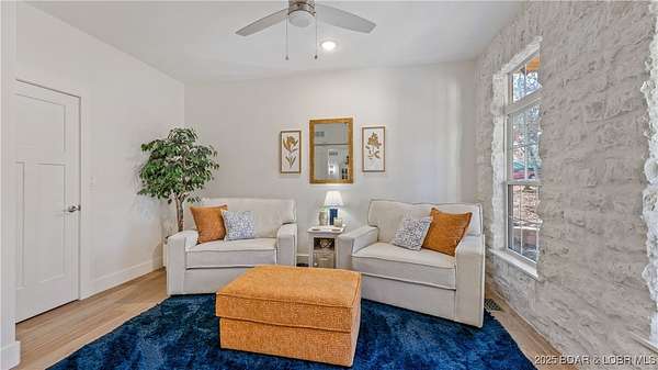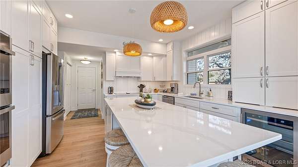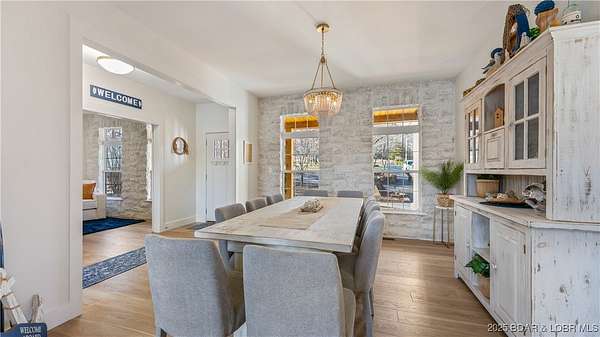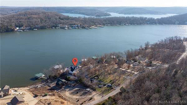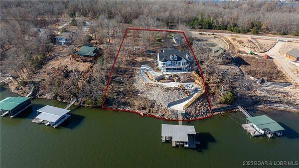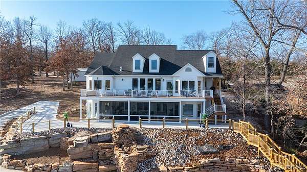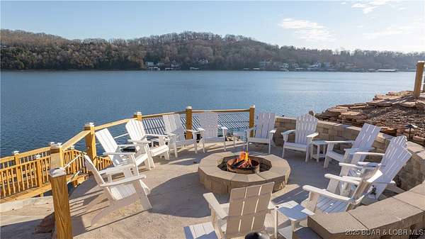 Stunning lakefront retreat on Big Island at Lake of the Ozarks! This fully renovated showstopper sits on approx. 2 acres with 204 ft of shoreline, has a detached 4-car garage, and a private 2 well dock with 3 PWC spaces and swim platform. Offering 5,114 sq ft, 8 bedrooms, and 4.5 baths, the home features main level living, vaulted ceilings, and expansive lakeside windows that fill the space with natural light. The main level master bedroom has its own private en-suite with walk-in in closet. The gorgeous kitchen stands out with stainless-steel appliances, double oven, quartz countertops, new cabinetry, and striking stone accents. Every detail has been updated-flooring, trim, doors, lighting, fixtures, and more. The lower level screened in patio is perfect for those summer afternoons. Outside, enjoy a beautifully transformed landscape complete with a waterfall made of natural rock, firepit, and golf cart path leading to your dock. Brand new roofs have been installed on the home, garage, and dock as well as new siding on the front of the home and the entire detached garage. Breathtaking main-channel views complete this extraordinary lakefront package.