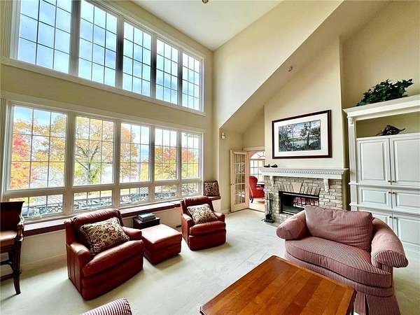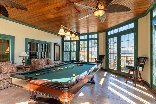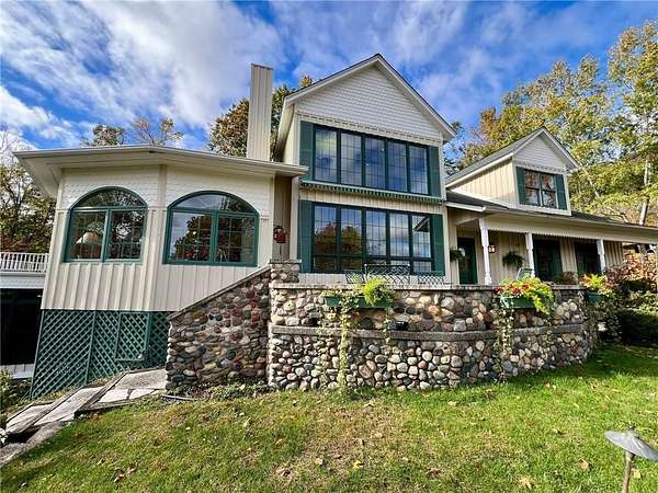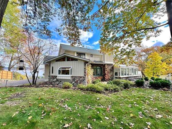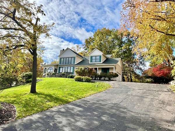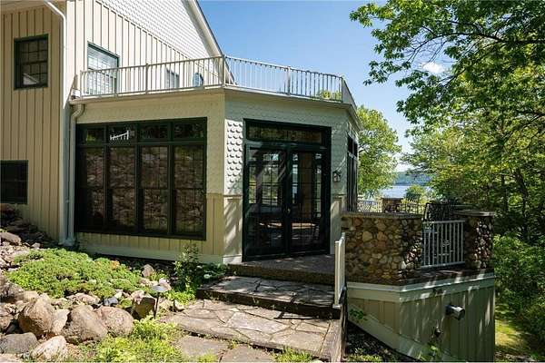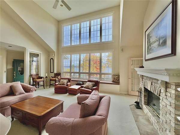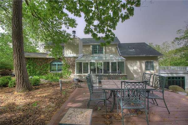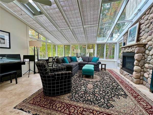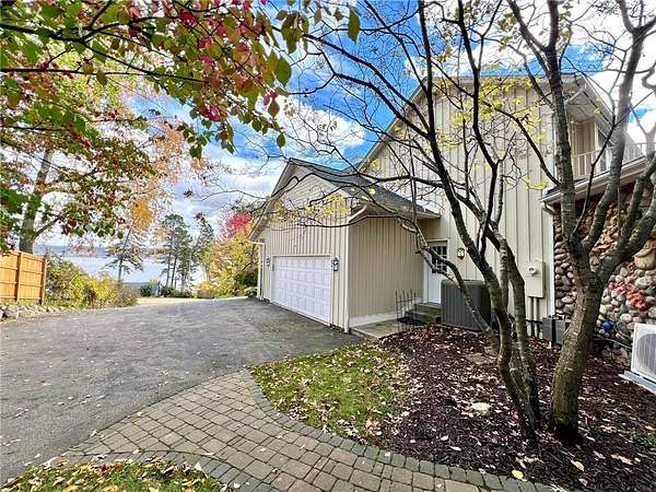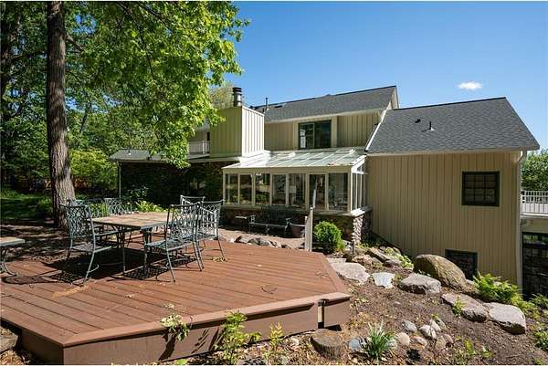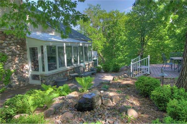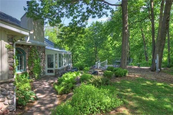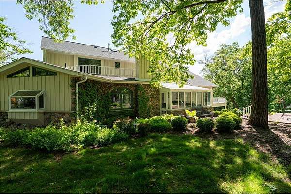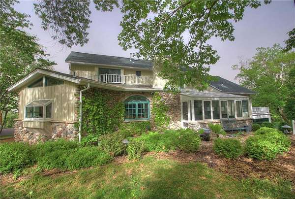 An amazing opportunity to own this 3.68-acre Old Frontenac estate with over 200 ft of sandy beach frontage on gorgeous Lake Pepin/Mississippi River. Enjoy fishing, swimming, boating, kayaking and more right out your front door. Your backyard is 2600 acre Frontenac State Park that includes 17 miles of hiking and cross country ski trails, camping and the highest bird species count of any park in the state. Custom designed 4 bedroom, 4 bath home with over 5200 sq. ft. of living space and panoramic river and bluff land views. Main level includes a vaulted living room with fireplace and floor to ceiling windows, a formal dining room, library, a sun-filled conservatory with in-floor heat, auto ceiling blinds and a gas fireplace, eat-in kitchen with center island/breakfast bar, informal dining with a wood burning fireplace and built in desk, primary bedroom suite with multiple closets and a full bath with hot tub, adjacent sun room/office with fireplace, 1/2 bath, foyer and mud room. Mudroom has space for future washer/dryer but hookups are not yet installed. Upper level includes 3 bedrooms and a 3/4 bath with tiled shower. In the lower level, you'll find family room/den with a beautiful built-in entertainment center, 3/4 bath, a billiards room with gas fireplace, laundry, storage, and utility room. Attached 2 car garage with a 3rd (tuck-under, insulated and heated) garage with plenty of space (504 sq. ft.) for additional toys and workshop. Front, rear and side stone patio areas and a dining deck. Private and wooded backyard with attractive landscaping, rock garden, fountain, and rock steps. Front yard is an expansive 3 acre lawn that rolls gently down to over 200 ft. of sandy beach shoreline with phenomenal views in all directions. You also have the privilege of watching an active bald eagle nest high in a tree close to the water. 1 hour to MSP; 40 minutes to Rochester. Surrounded by Frontenac State Park and Lake Pepin, Old Frontenac was founded in the 1850s and retains a gentle, peaceful ambience of the past. This property offers a quiet and private lifestyle in a charming, unique and historic community.