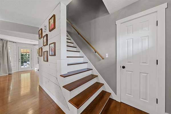 - Barn, Concrete Walks, Covered Front Porch, Covered Patio, Exterior Lights, Landscaping, Mature Trees, Outdoor Lighting, Storage Shed, Trees