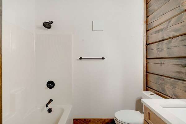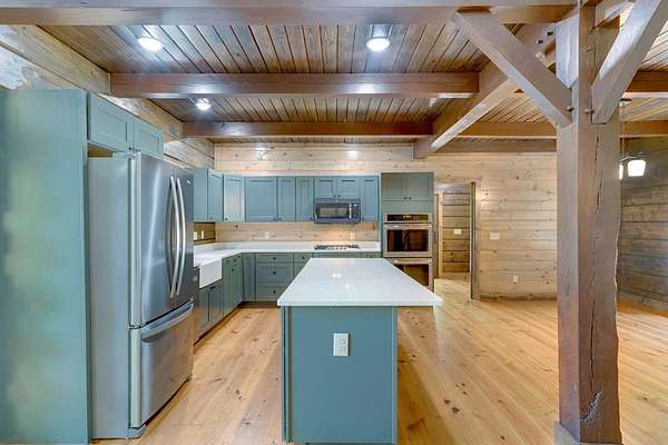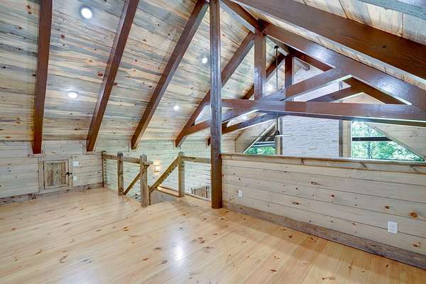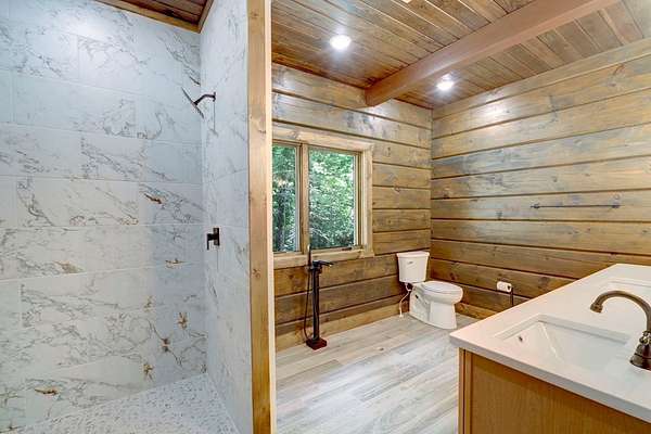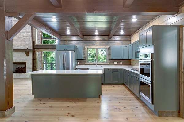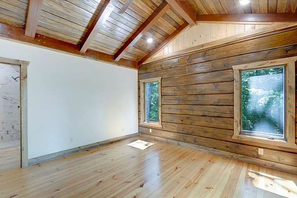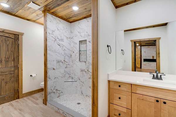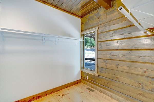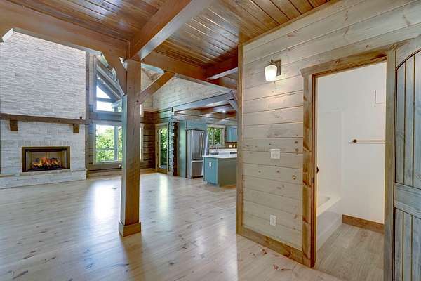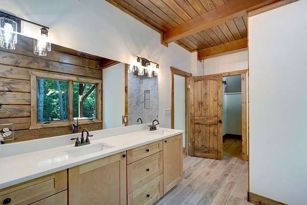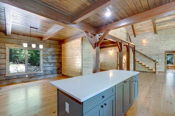 - Cathedral Ceiling(s), Ceiling Fan(s), Double Vanity, Kitchen Island, Laundry On Main, Primary On Main, Quartz Counters, Solid Surface Counters, Tile Shower/Tub, Walk-In Closet(s), Wood Ceiling(s), Wood Walls