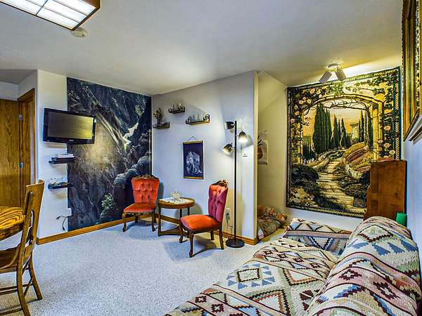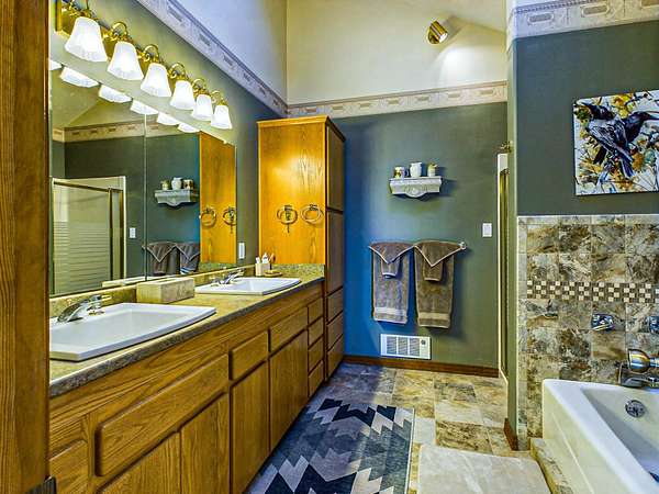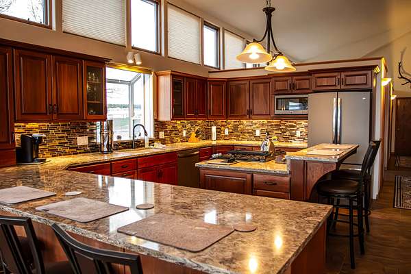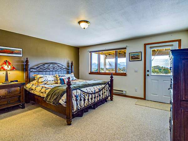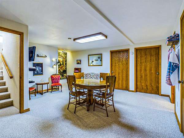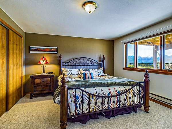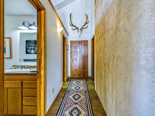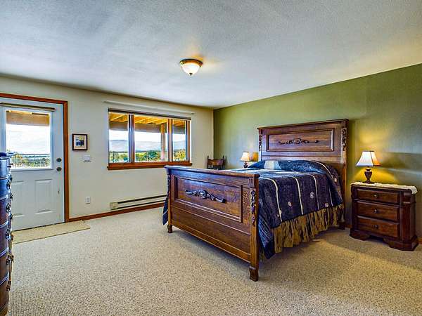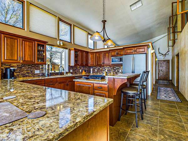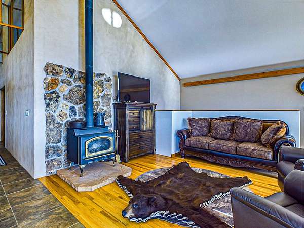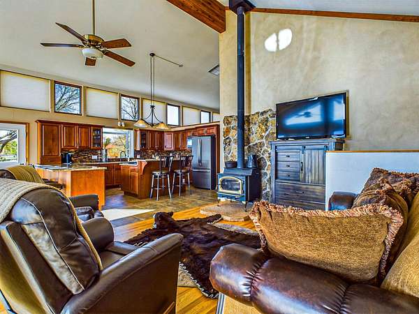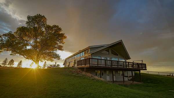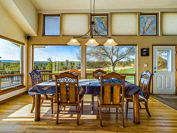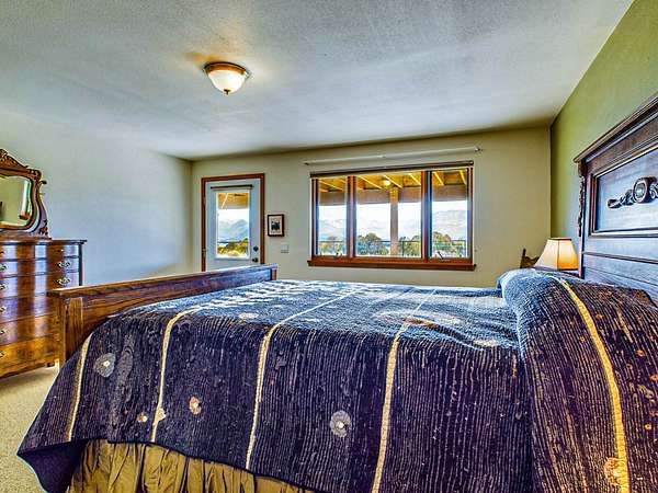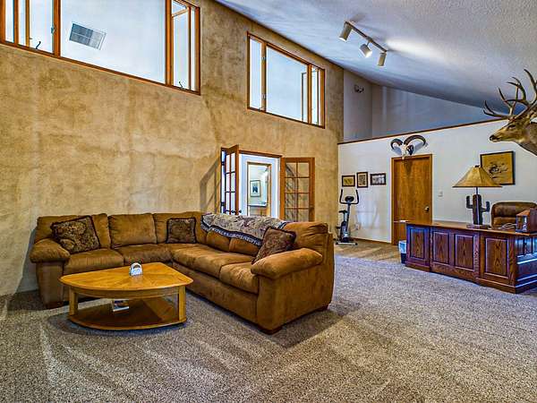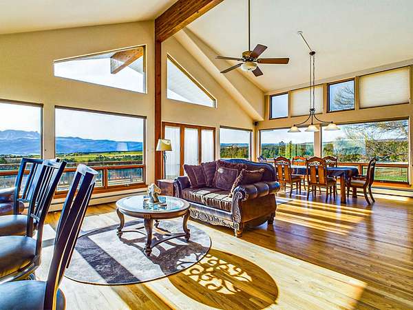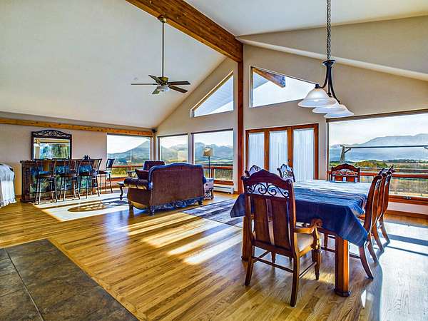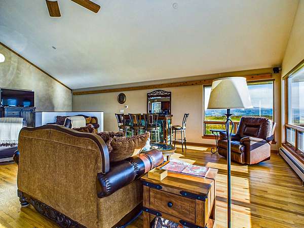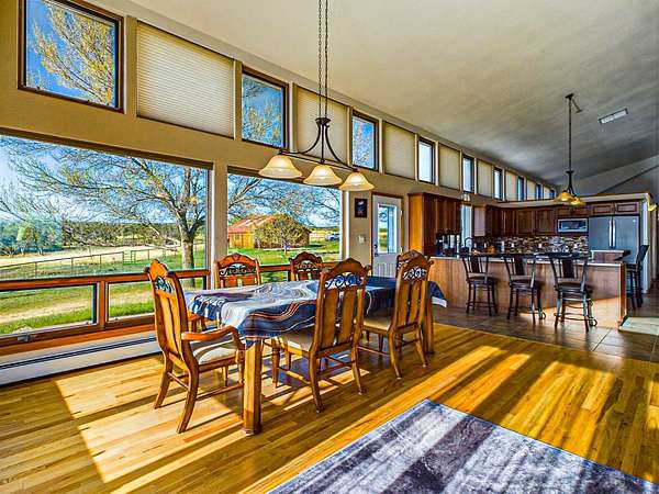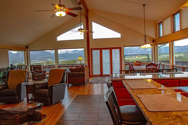 The main residence spans over 4,300 square feet and features 4 bedrooms, 3.5 bathrooms, a spacious kitchen and bar area, game room, office, and sauna. Large picture windows and an expansive east-facing deck frame panoramic mountain views. The home's layout balances comfort and elegance, perfect for entertaining guests or unwinding after a day on the ranch.