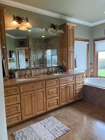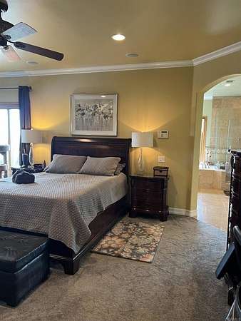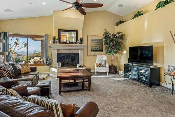 This gated estate welcomes you with a stunning palm-lined driveway and offers exceptional space and comfort. Inside, you'll find 4 bedrooms, 3 bathrooms. The spacious primary suite features a luxurious bath with a jetted tub, oversized shower, fireplace and walk-in closet. A beautiful mosaic inlay accents the travertine flooring in the entry, leading to a living room with a dual-sided fireplace shared with the dining area. The chef's kitchen boasts a large island, generous storage, and a premium Viking appliance package. Two additional bedrooms share a Jack-and-Jill bathroom. A well-equipped laundry room with utility sink and appliances (included) adds convenience. Additional highlights include wide hallways with built-in storage, central vacuum system, and a 3-car garage. Outdoors, enjoy the paver patio with firepit, artificial turf for low-maintenance entertaining, and two large sheds--ideal for storage or possible ADU use. Ample parking with a spacious driveway and side yard for boat or RV. Fully fenced, with propane, septic, and city water.