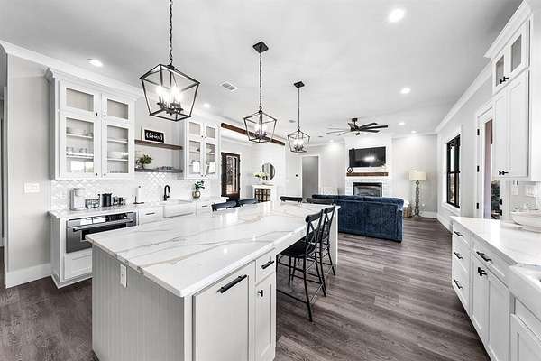 At the heart of the home is a true showpiece - an expansive gourmet kitchen featuring a massive island with seating for 6 - 8, custom cabinetry, high-end appliances, and a dedicated coffee bar. This open-concept space flows seamlessly into the living area, creating a natural gathering place ideal for hosting and connection.