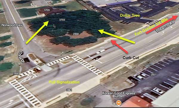 This property is at the corner of Cresr Drive and Tobacco to the left of Dollar Tree approximately 3/4 mile from Fort Gordon and the intersection with Deans Bridge Road (US Hwy #1). It is the first traffic light heading out of Fort Gordon heading East on Tobacco Road on the right.