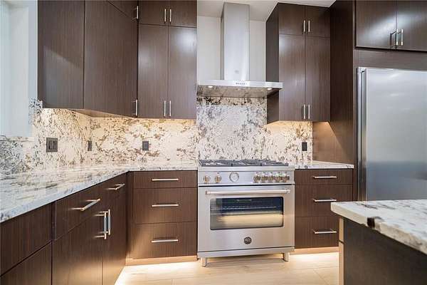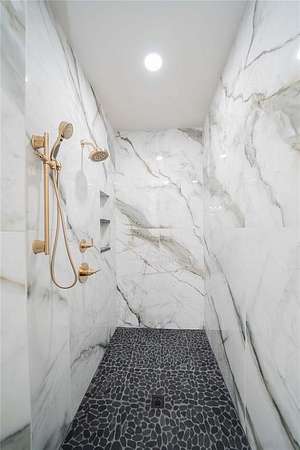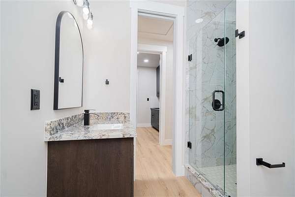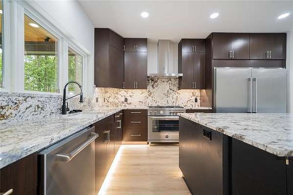 Each bathroom is a showpiece, boasting designer tile combinations that elevate the overall aesthetic and add a custom flair to every space. The master suite is a private retreat, featuring expansive sliding glass doors that open directly to the patio, inviting in natural light and lake breezes.