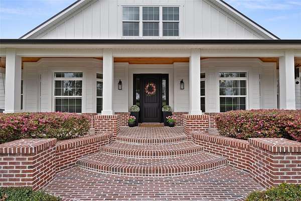 The exterior showcases custom brickwork with white mortar joints, creating a distinctive modern farmhouse aesthetic that sets this home apart. The charming front porch and entry provide a warm and inviting first impression, perfectly capturing the essence of elevated country living and ideal serene relaxation.