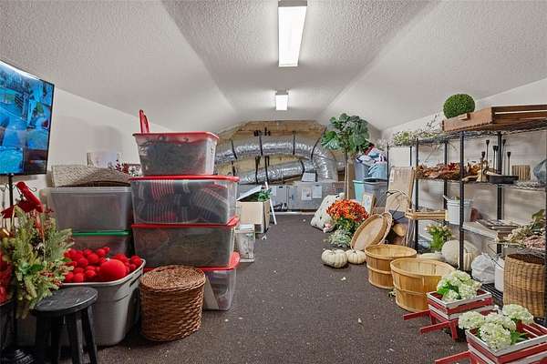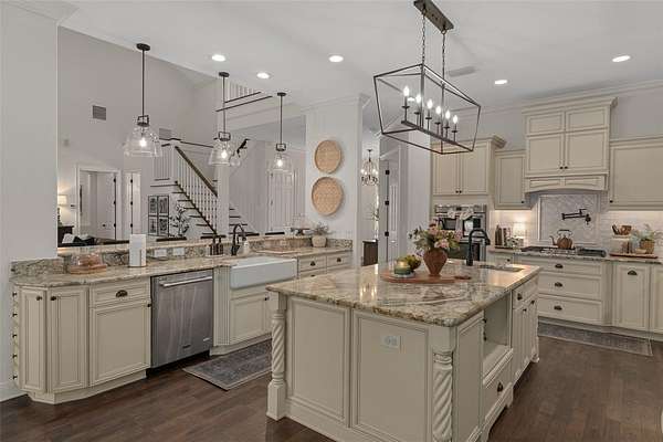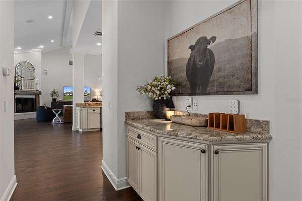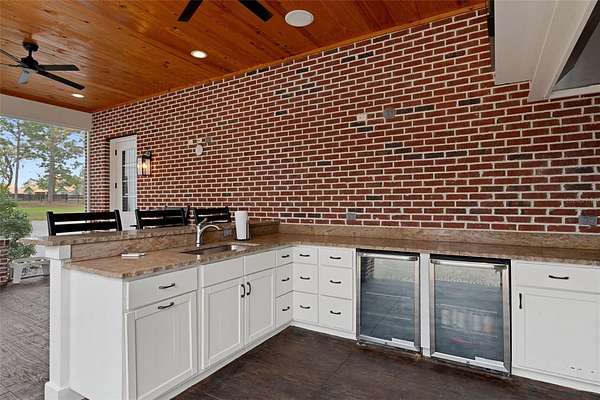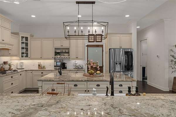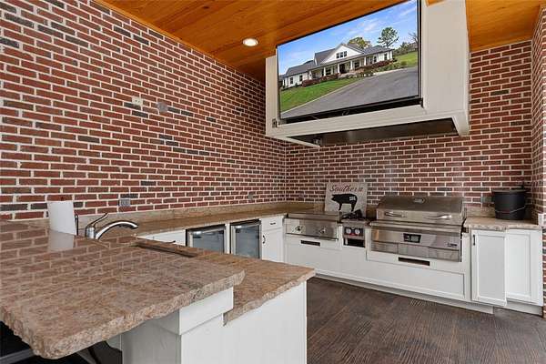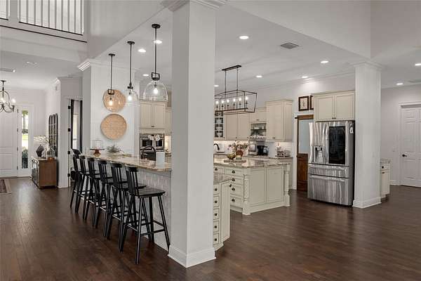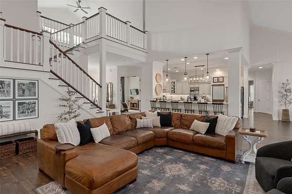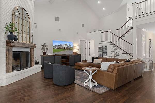 The recently updated residence offers 4,647 square feet of living space and over 7,700 square feet under roof, showcasing soaring ceilings, rich wood, Luxury Vinyl plank flooring, and a striking floor-to-ceiling brick fireplace that anchors the open-concept living area. Natural light fills the home, creating a warm yet elevated farmhouse feel throughout affording great views at every point.