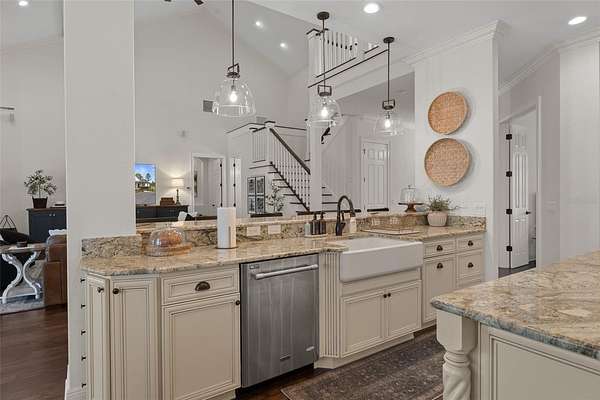 - Cathedral Ceiling(s), Eat-In Kitchen, High Ceilings, Open Floorplan, Primary Bedroom Main Floor, Stone Counters