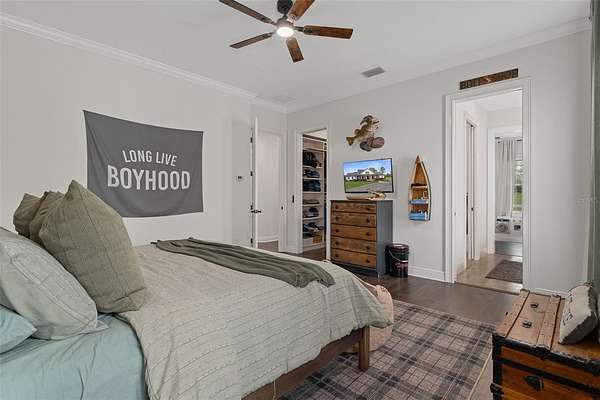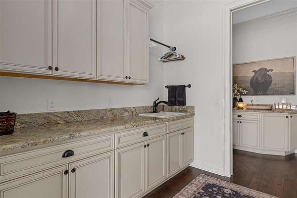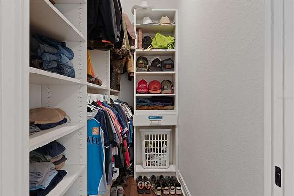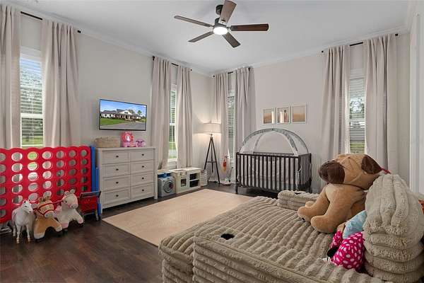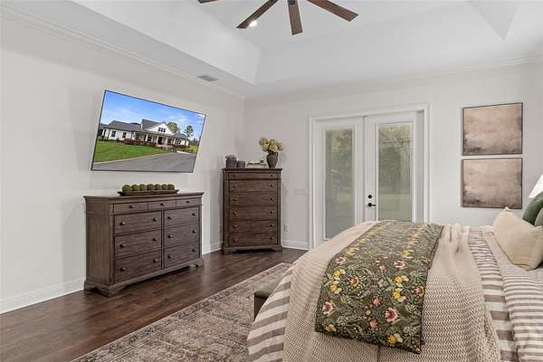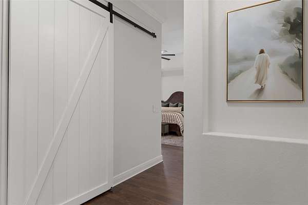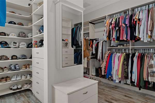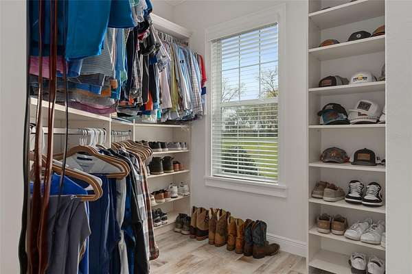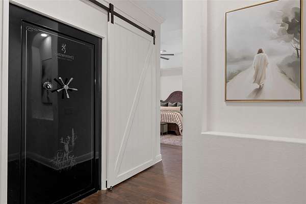 The primary suite is a true retreat, featuring a spacious custom walk-in closet and a private walk-in safe room with custom wood interior suitable for safe space for guns or valuables and/or personal safety. The primary bathroom offers a spa-like experience with an oversized walk-in shower, dual shower heads, and quality finishes designed for both comfort and style.