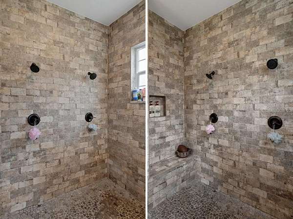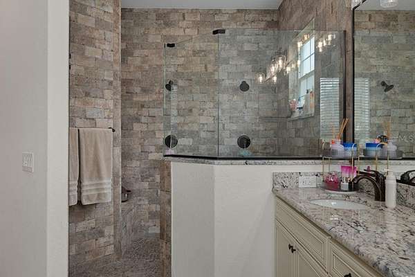 Step outside and experience a resort-style setting designed for both relaxation and entertaining. The custom pool features a beach entry, water slide, and spa, all surrounded by expansive paver decking and multiple seating areas. A dedicated pool bath adds convenience, while the outdoor kitchen and bar, along with a covered lanai showcasing a custom wood ceiling, roll-down screens, and wood-burning fireplace, create a seamless indoor-outdoor living experience. In the evening, the extensive landscape lighting transforms the property into a stunning private retreat. An integrated indoor and outdoor Bose sound system enhances the atmosphere throughout the home and outdoor spaces.