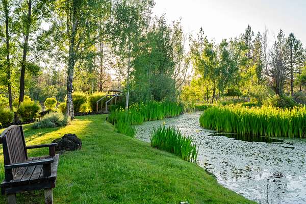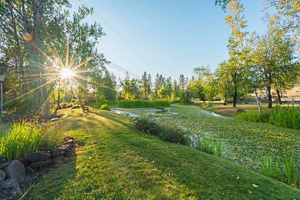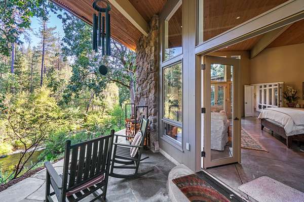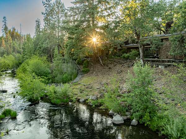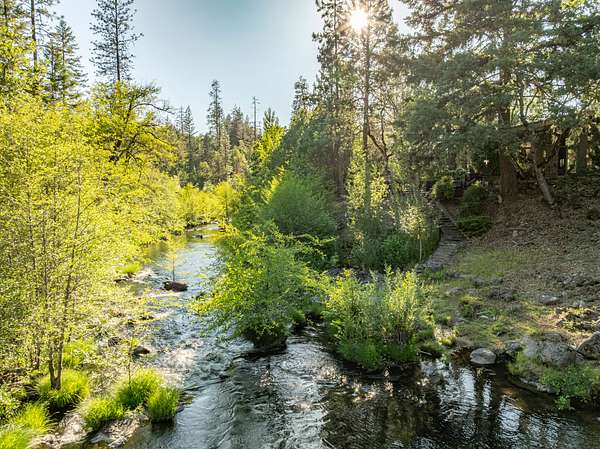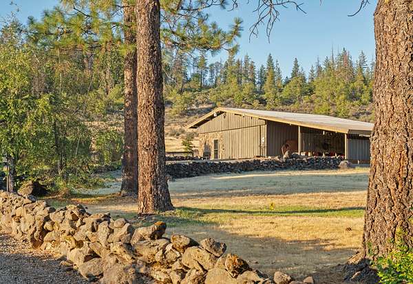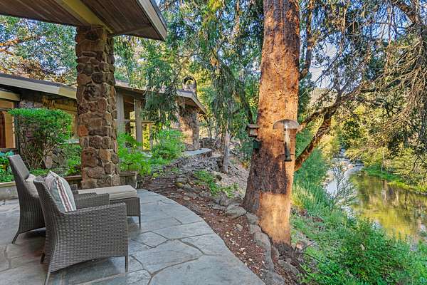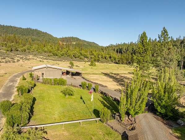 Opportunities to own a property like this are almost never seen. Set above Big Butte Creek with more than 1,200 feet of live water frontage, this 40 acre estate is bordered on three sides by over 7,000 acres of public land, creating an unmatched sense of privacy and access to recreation. The residence blends modern design with Northwest lodge character, centered on a dramatic great room with soaring ceilings, walls of glass, and a stone fireplace overlooking the creek and evergreens. The master suite is a private retreat with vaulted ceilings, dual baths, and patios perched above the water, while guest accommodations provide comfort for family and friends. Outdoor living is equally inviting with patios, decks, a newly finished pool, and a one half acre pond with dock and pond house. Trails, gardens, and the surrounding public land extend opportunities for hunting, hiking, horseback riding, and year-round adventure. This is more than a home, it is a private sanctuary.