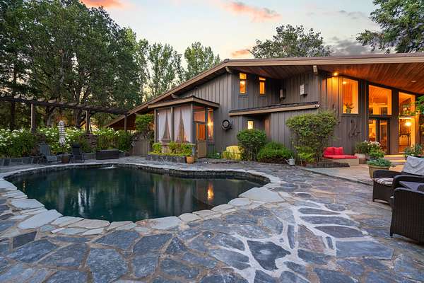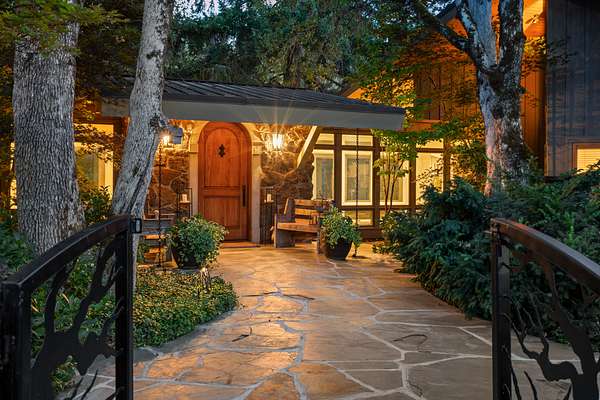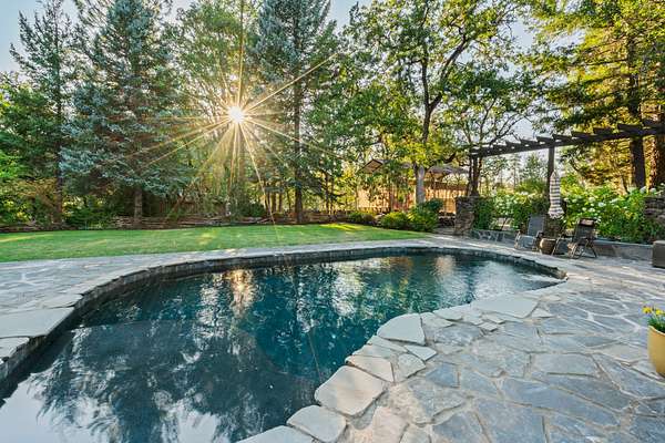 Outdoor living is equally refined, featuring a newly updated in-ground PebbleTec pool (2025), multiple covered patios, and a large creekfront deck connected by landscaped paths and concrete steps to the water's edge. An outdoor kitchen under a glass roof and a fire pit above the riffles extend seasonal living. A one-half-acre pond with dock, deck, and pond house anchors the grounds, complemented by a large lawn, fenced gardens, two greenhouses, and a small dog run. Entry is defined by a dual security gate, landscaped rock walls, lush ornamental plantings, and towering mature trees, offering a private and distinguished arrival.