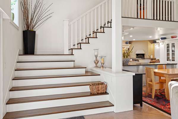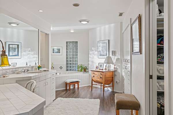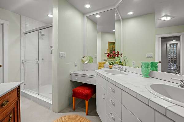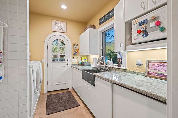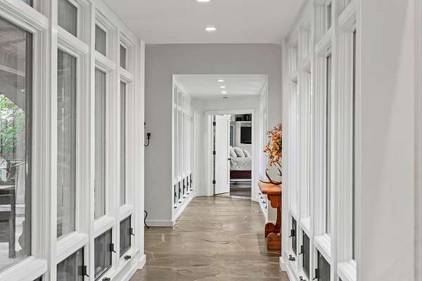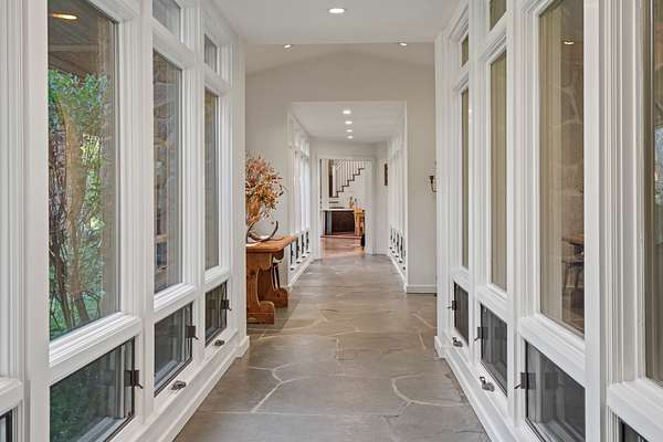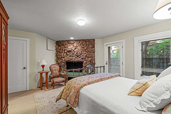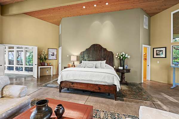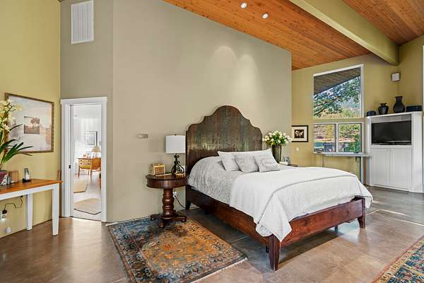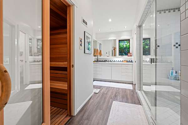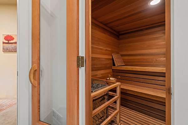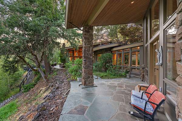 The master suite is reached by a window-lined hallway across a courtyard, a design element that draws the outdoors into daily living. Inside, vaulted ceilings and a stone fireplace create warmth, while two large covered patios provide private creekside views. Dual baths offer separate retreats--his with a steam shower, sauna, and walk-in closet; hers with a soaking tub, custom jewelry cabinetry, walk-in closet, and generous counters. A dedicated laundry with access to the hot tub completes the suite. The guest wing includes two ensuite bedrooms, a private jacuzzi room, and its own laundry, while the loft level includes a full bath for additional flexibility.