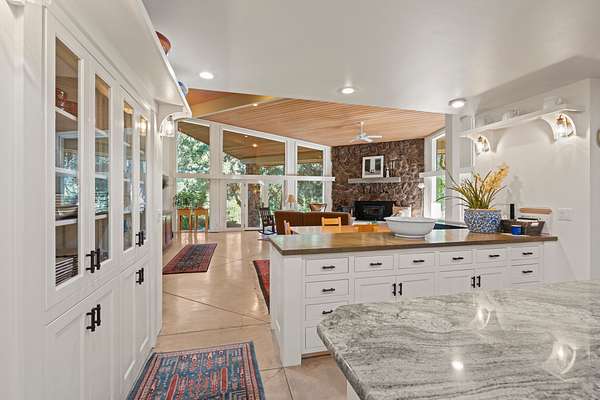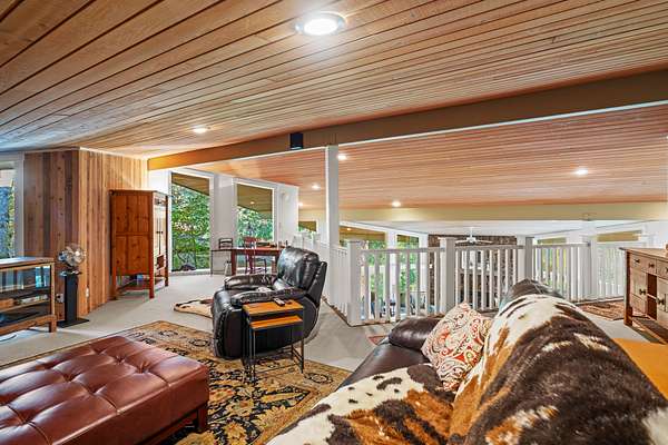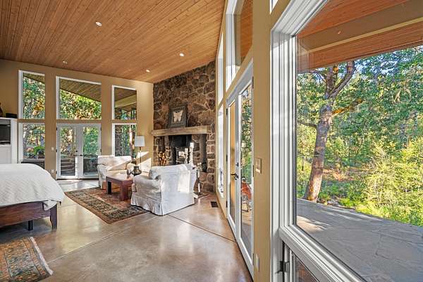 A unique great room anchors the home, featuring a floor-to-ceiling rock fireplace, vaulted tongue-and-groove ceilings with open beams, and expansive walls of glass that bring in natural light and frame views of the creek and surrounding evergreens. An open loft overlooks the space, enhancing its sense of volume and connection. The kitchen combines rustic character with modern function, offering painted solid-wood cabinetry, granite and concrete counters, a large island, walk-in pantry, built-in breakfast nook, and china hutch, along with high-end Sub-Zero, Wolf, and Bosch appliances and a built-in pizza oven.