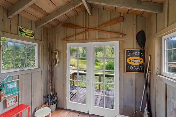 The property is complemented by a well-designed collection of outbuildings that extend its functionality and character. At the center is the primary shop complex, measuring approximately 40' x 72' including both the shop and attached carport. The shop itself is about 40' x 40' and finished to match the main residence with board-and-batten siding, stone accents, and a durable metal roof. Inside, it is well-appointed with an office, gym, hobby space currently used for fly-tying, a secure storage room, loft storage, and a large bay with fuel tanks. Attached to the shop is a two-bay carport measuring roughly 40' deep by 32' wide, providing extensive covered storage and work space.