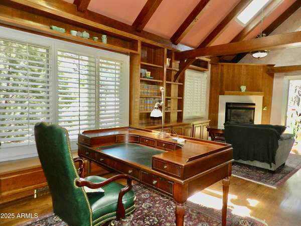 Inside, rich oak flooring, exposed beams, and thoughtful finishes create a warm, inviting ambiance throughout. The home offers 4 spacious bedrooms and 3 well-appointed bathrooms, including a stunning main-floor master wing featuring its own private library, fireplace, sitting area, spa-like bath with jetted garden tub, dressing area, and an expansive private deck. Designed for both quiet retreats and vibrant entertaining, the massive living room features soaring ceilings, a gas fireplace, and beautiful custom built-ins. Adjacent, the spacious dining room flows seamlessly to an oversized deck perfect for gatherings under the pines.