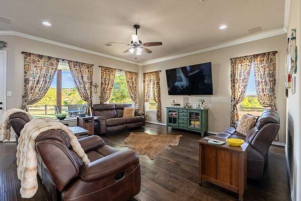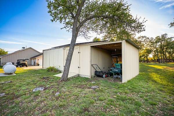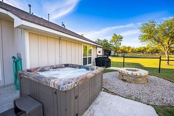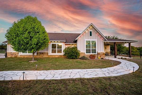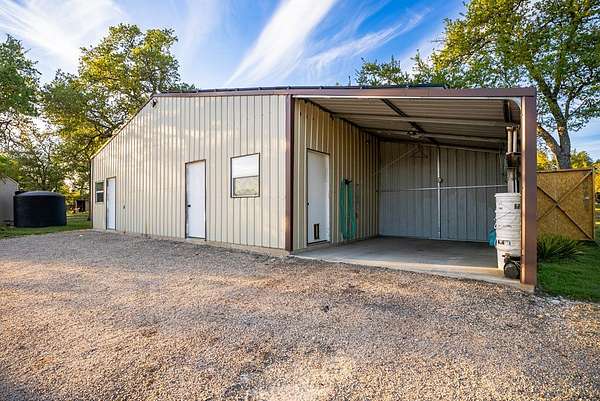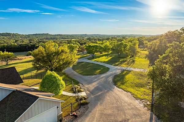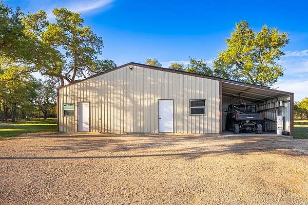 Rare opportunity to own 55.16 acres of unrestricted Texas Hill Country land with views for miles, ideally located just minutes from Fredericksburg and Luckenbach. This beautiful property offers prime Ranch Road 1888 frontage, gentle topography, and outstanding usability with potential to subdivide or create a family compound, investment property, recreational retreat, horse property, or commercial use. The land features two large tanks and a scenic old rock dam, along with a corral and goat enclosure complete with playground equipment, plus a goat barn equipped with electricity, making it ideal for livestock, ag use, or hobby farming. The property includes a well-maintained 3-bedroom, 2-bath home built in 2017 with approximately 2,000 sq ft, featuring an open-concept layout, gas stove, engineered hardwood floors, and quartz countertops. The home sits on 5.86 acres with an electric gate and perimeter fencing, offering privacy and convenience. Additional improvements include a 45x15 metal workshop/storage building with full bath and washer/dryer connections, ideal for conversion to guest quarters, along with a full RV hookup with septic. Property is serviced by a strong 15 GPM well, 2,500-gallon water storage tank, and solar panels. With excellent road frontage, expansive acreage agricultural improvements, and unmatched flexibility due to no restrictions, this is a standout opportunity in one of the most desirable areas of Gillespie County.