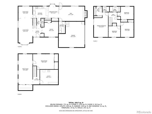 - Bathroom Full, Bathroom Half, Bedroom x 3, Bonus Room, Den, Dining Room, Family Room, Kitchen, Laundry, Living Room, Office, Utility Room