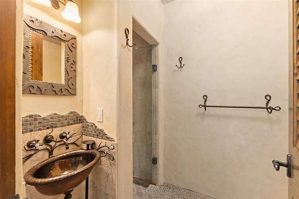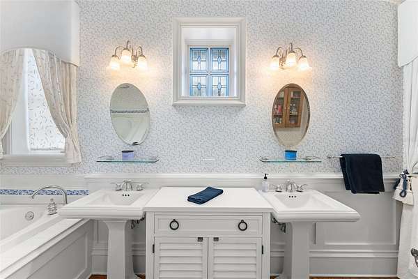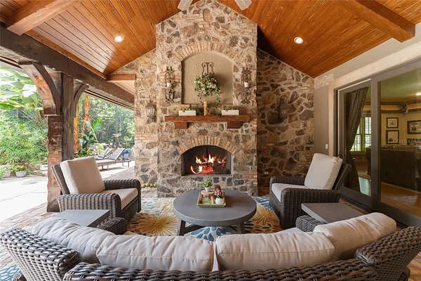 The main residence blends architectural presence with everyday livability. Six bedrooms, eight full baths, and three half baths are arranged across two levels and connected by a dramatic curved staircase and private elevator. Five gas fireplaces, stone accents, custom millwork, and designer lighting create a warm yet refined atmosphere throughout. Flexible living spaces include a primary suite with adjacent nanny room, library, private office, hobby studio, game room, upstairs den, gym, two laundry rooms, pet wash station, and a distinctive treehouse-style lounge that offers a unique retreat within the home.