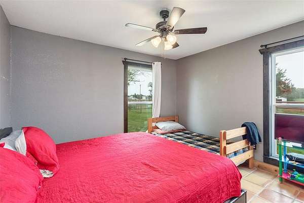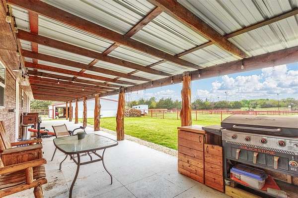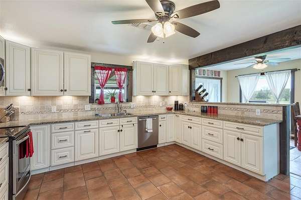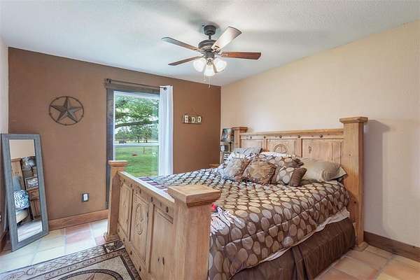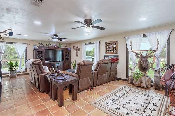 Nestled on over 22 acres of beautiful land with 2 ponds, this sprawling property offers the perfect blend of luxury living and equestrian amenities. The spacious 5 bed, 3 bath home provides comfort and style, ideal for family living and entertaining. With over 2,500 square feet of living space, the home features an open floor plan with Mexican Saltillo tile throughout; an updated kitchen, hidden safe room or gun room with built in gun safe and an over sized outdoor kitchen featuring live edge counters.