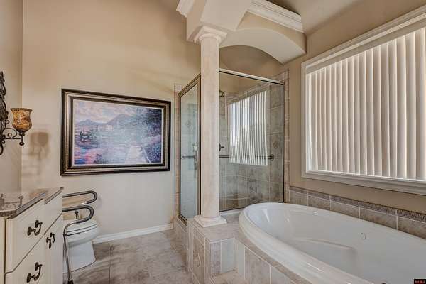 - Carpet, Garage Door Open, Laminate Floor, Smoke Detectors, Split Bedroom Plan, Tile Floors, Whirlpool Tub