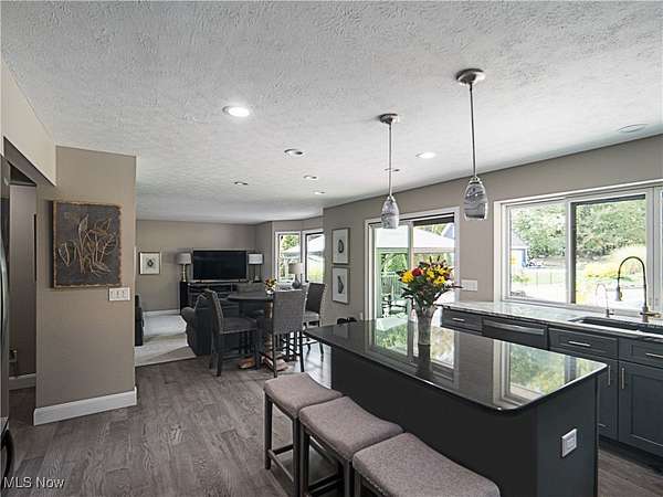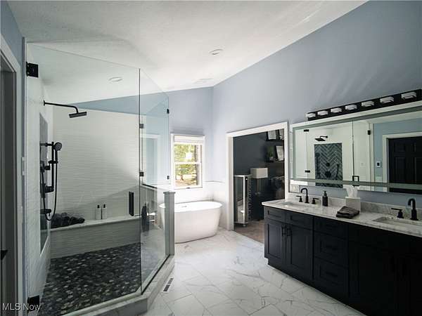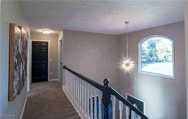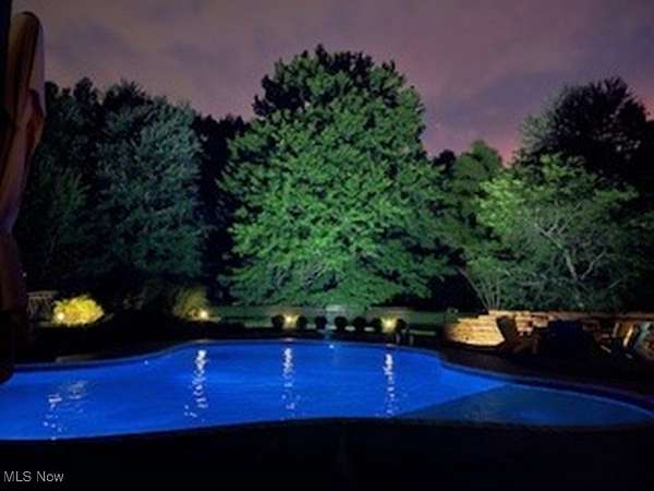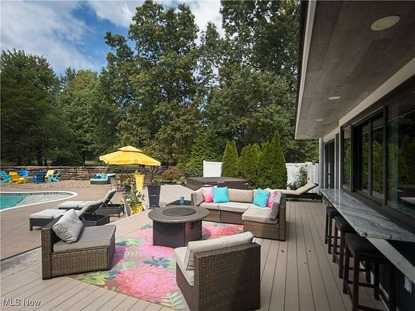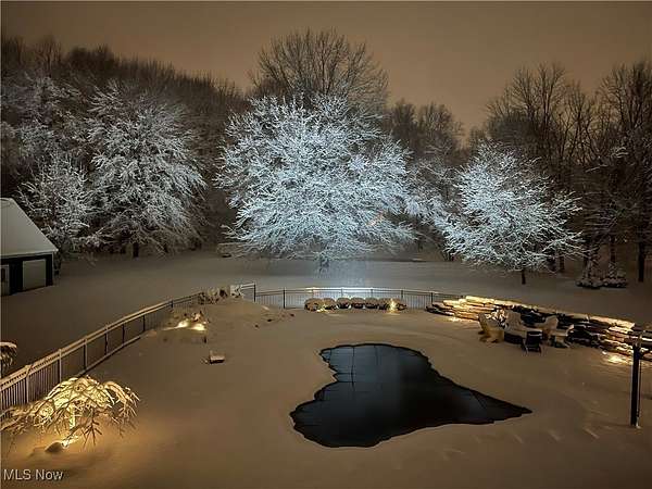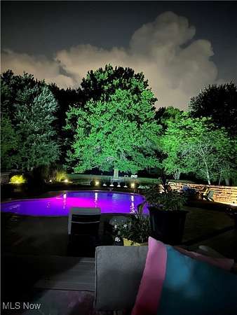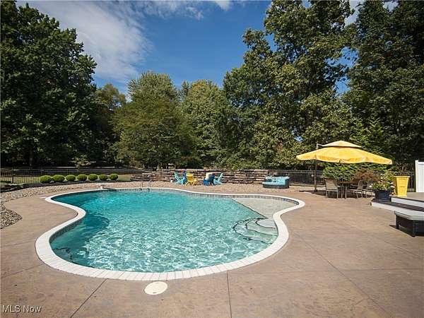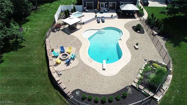 Come home to a beautiful park-like setting on 4 private acres with saltwater pool, hot tub, and pond-perfect for entertaining! Custom-built Colonial features a large family room with new plush carpet. Eat-in kitchen offers granite countertops, island with outlet, walk-in pantry, black stainless appliances, bar with wine and beer fridges, reverse osmosis water system, and new hardwood floors. Panoramic window opens to pool bar for easy outdoor serving. Spacious mudroom with custom cabinets, shoe drawers, and coat storage. Second guest closet off 2-story foyer. Office with French doors overlooks pool-ideal for working from home while watching kids. Gas fireplace in flex dining/living room. First and second floor laundries. Upstairs has 4 bedrooms, 2 full baths. Large primary suite with cathedral ceiling, solar skylights with built-in blinds. Primary bath includes vaulted ceiling, soaking tub, giant tile shower with bench, lighted mirrored double vanity, heated tile floor. Huge walk-in closet fits 150+ shoes, granite island, chandelier, skylight, ironing board, built-in safe. Basement has newly finished rec room with deluxe carpet and vinyl plank flooring, built-in cabinets, large storage room with shelving, multiple closets, and separate workshop with air compressor and 18-ft workbench. Workshop connects to 686 sq. ft. 2.5-car garage with hot/cold water and built-in compressor. 2020 HVAC with humidifier. Upgraded 200 amp panel. Exterior: low-maintenance saltwater concrete pool with tanning ledge, benches, diving board, large deck, hot tub, fire pit, outdoor speakers. Heated 704 sq. ft. outbuilding with loft, workbench, 220 electric, 80-gallon compressor. . In-ground RainBird yard sprinkler system is sourced from well-water. House has city water and sewer. 4 private acres, set-back from road by lighted tree-lined driveway. Secluded yet walkable to all Tallmadge City Schools. Hardie cement siding and metal roof. All appliances stay and furniture negotiable too.