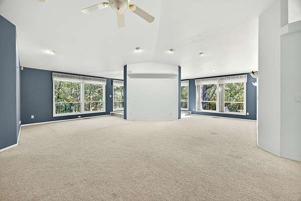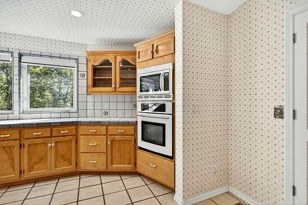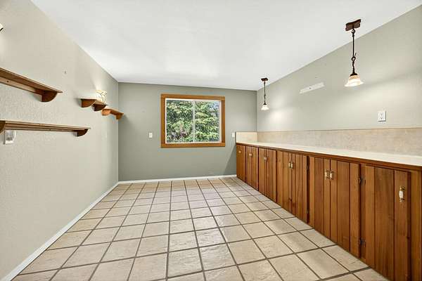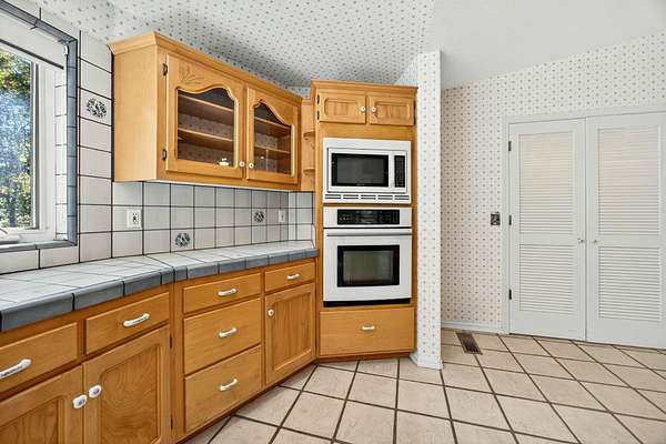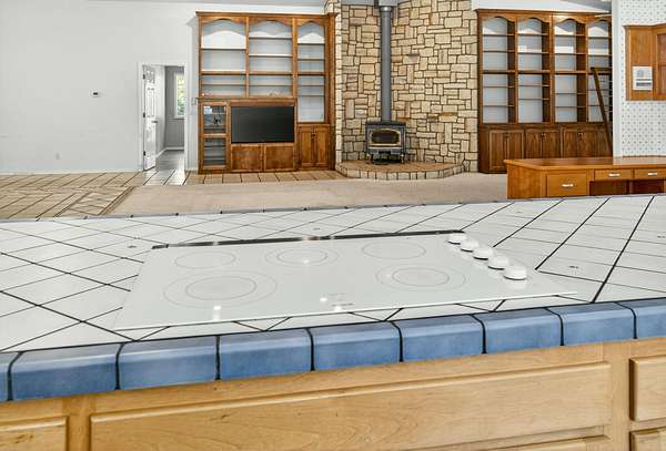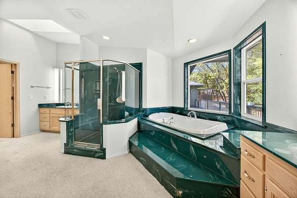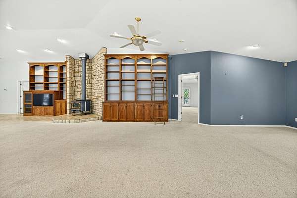 - Breakfast Bar, Built-In Features, Ceiling Fan(s), Double Vanity, Enclosed Toilet(s), Kitchen Island, Open Floorplan, Pantry, Primary Downstairs, Shower/Tub Combo, Tile Counters, Vaulted Ceiling(s), Walk-In Closet(s)