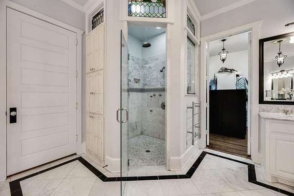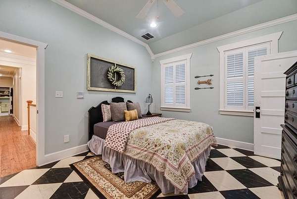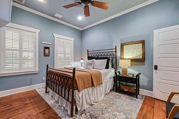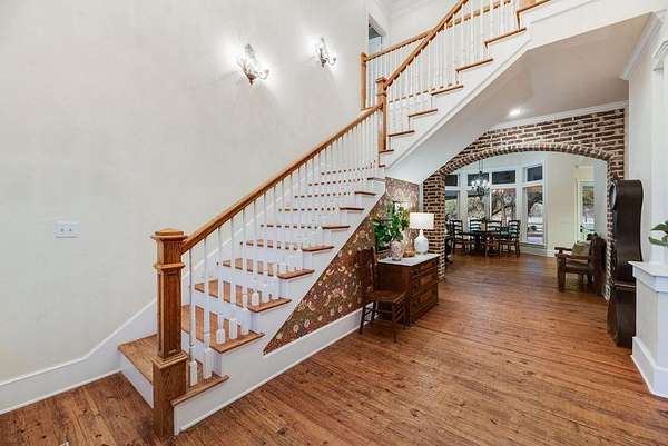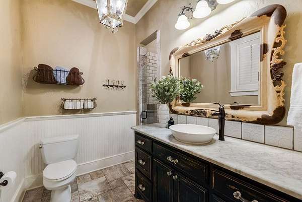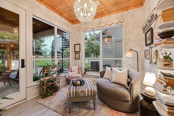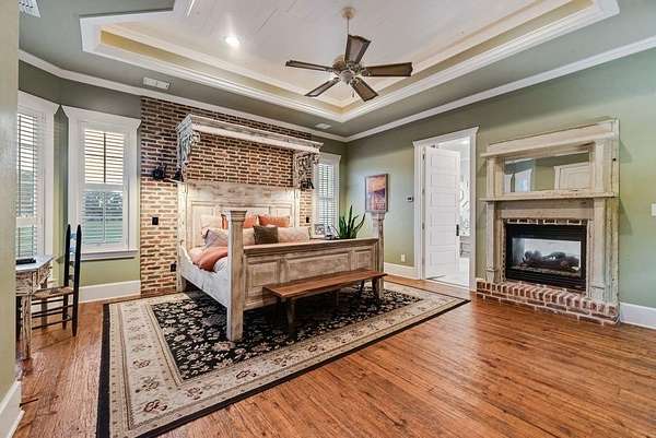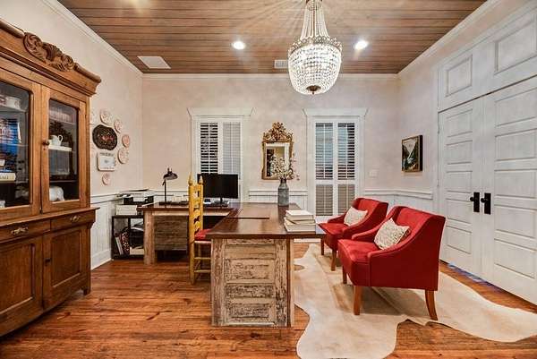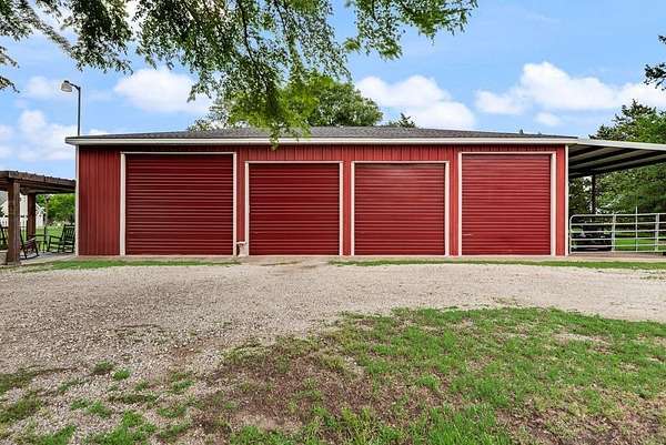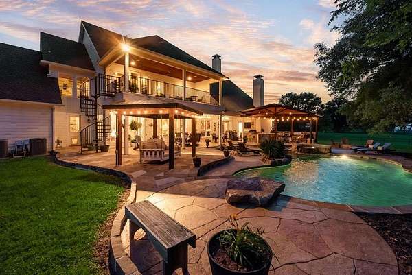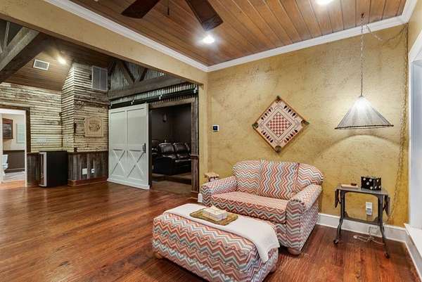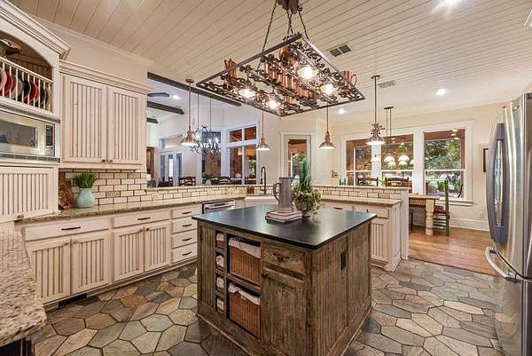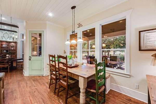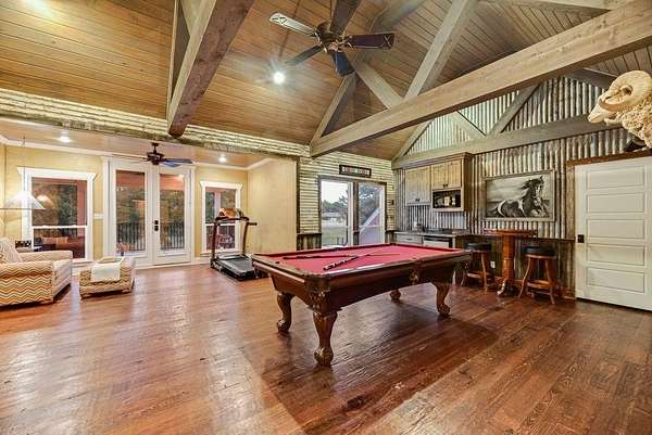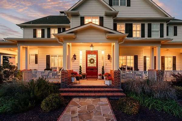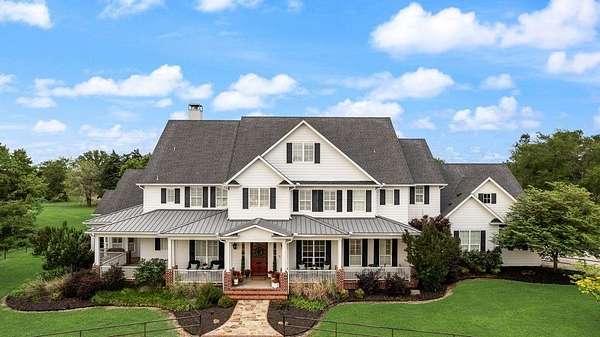 This stunning Southern Living-inspired dream home, situated on a sprawling 12.795 acre estate, blends timeless Southern architecture with modern luxury and functional recreational and equestrian facilities. TOTAL LIVING SPACE SF is 6,956.5 between the primary home and separate building. The property features a thoughtfully designed main house with a expansive front porch, custom millwork, light-filled living spaces, re-milled hand scraped wood flooring, and high ceilings with wood beams. Additional interior features of this beautiful home include designer windows relocated from a Brookstone in NYC, several decorative transom windows, stained glass windows, plantation shutters, copper sinks, a variety of gorgeous light fixtures, antique washboard sink, luxurious primary bathroom with clawfoot tub and fireplace, decorative doors including dutch and barn doors, sophisticated wood and metal features throughout, a 5-Star 6-burner gas double oven, wet bar or wine area, office, reading room, gift wrap area, mudroom, formal living area, and over 400 sf of additional storage (no ac). The upstairs entertainment area features a HUGE game room (pool table stays) and media room (media chairs and projection equipment stays). And an extra plus - ALL bedrooms include ensuites with nicely sized walk in closets.
