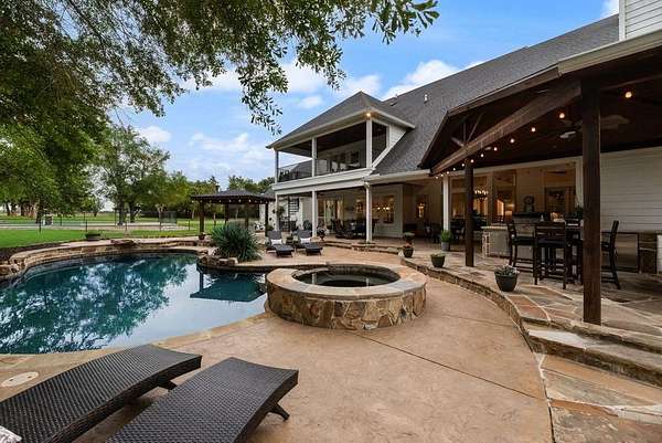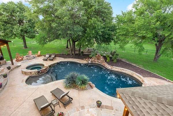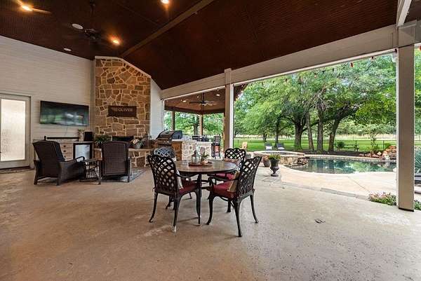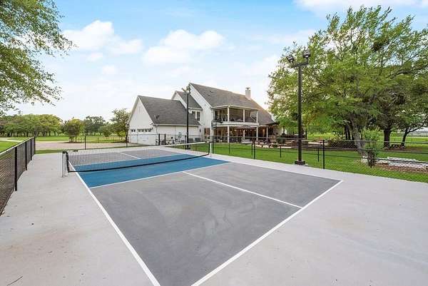Let's talk about the amazing outdoor oasis... This picturesque retreat includes a saltwater-chlorine combo pool and spa, fireplace, outdoor kitchen that includes a sink, gas grill, griddle and pizza oven. Additional features include a firepit, covered cabana with a daybed style swing, an enormous amount of open and covered space for entertaining, regulation size pickleball court, 1.5 acre pond, private gated entrance and entirely fenced. Last but not least, the 60x40 separate building has an additional 2 bedroom, 2 bath and open living-kitchen area, a great amount of storage capacity, and 4 walk-in horse stalls.