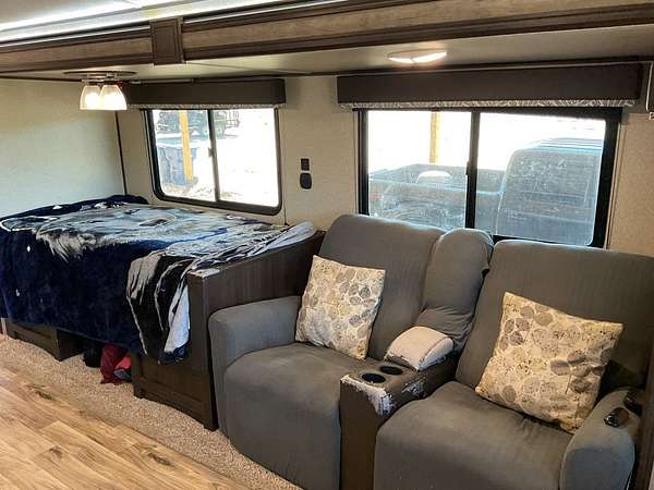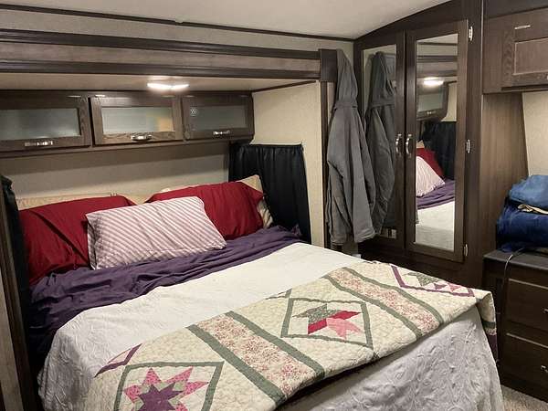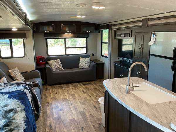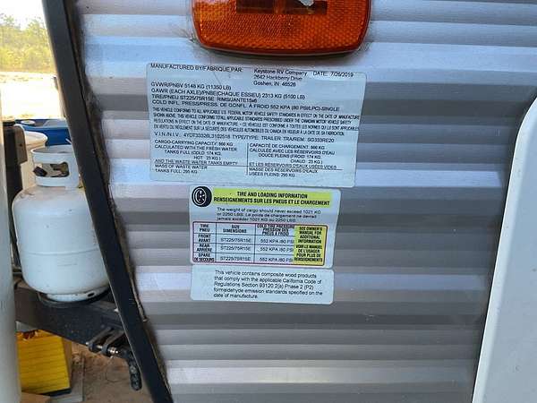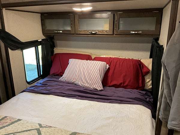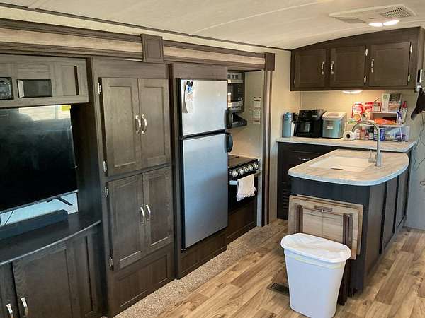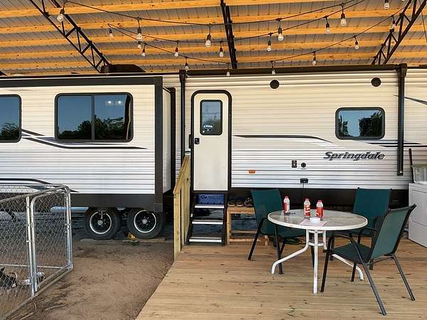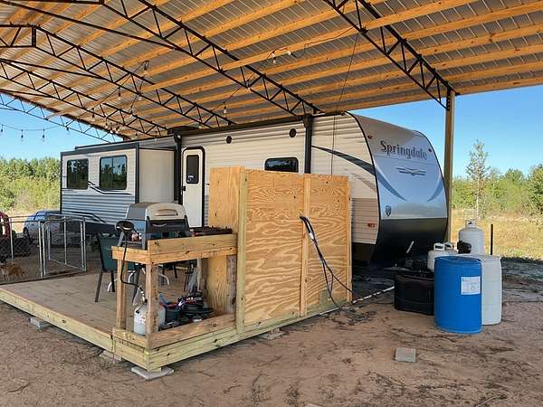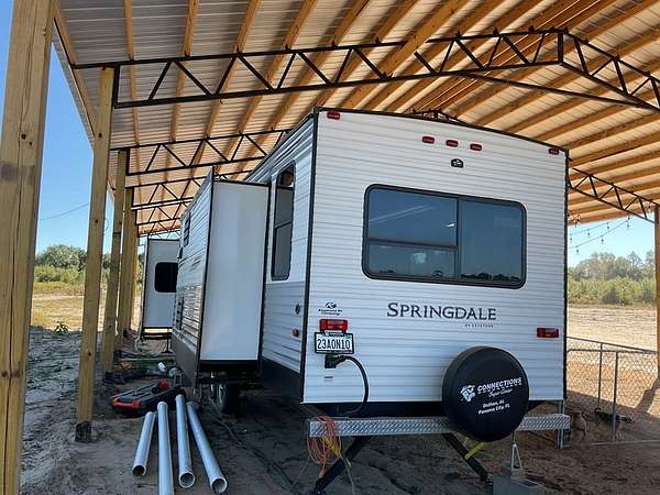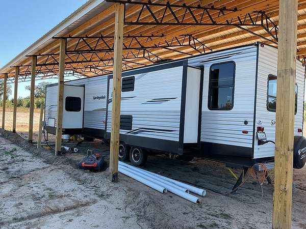 28809 Bell Crossing Road, Opp, AL 36467 The RV is 33' long with 3 slides and has a rear entertainment. The TV, 2 Ref, washer and dryer stay with the RV, which has a tankless water heater using propane, queen bed in master with lots of storage, and county water and power hooked up.