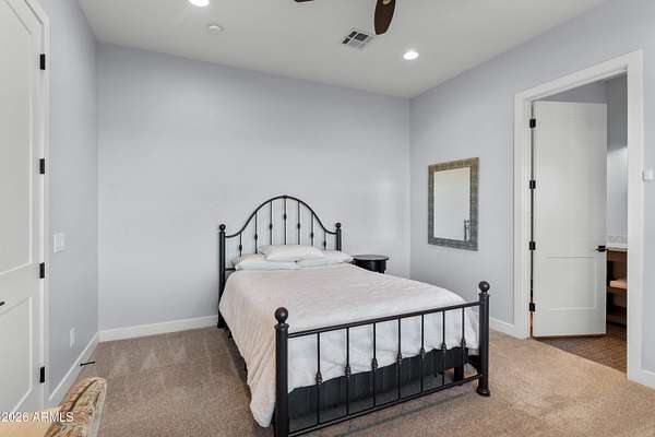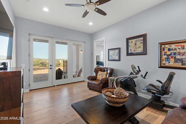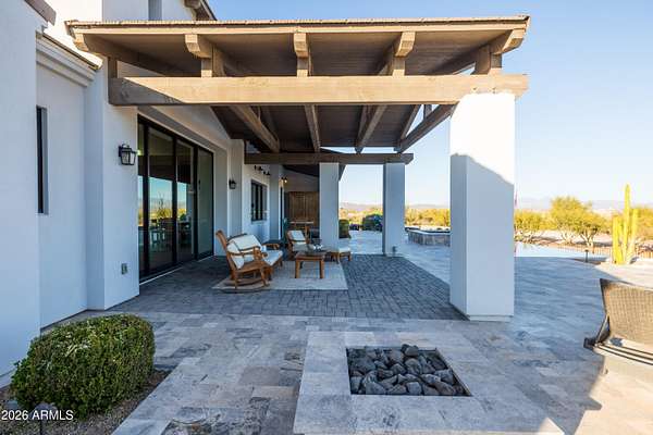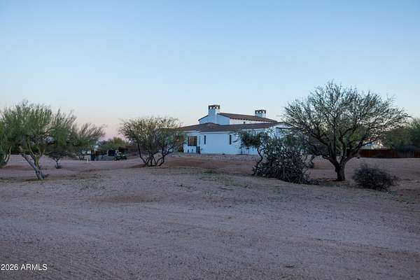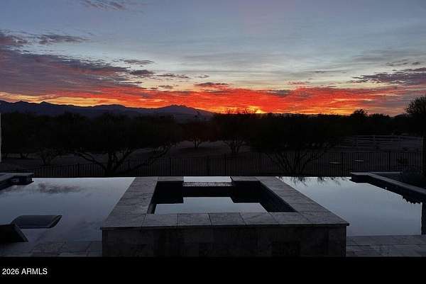 Welcome to a truly special home! The tone is set from the moment you step inside, with soaring 18'ft ceilings in the great room, rich wood plank floors & an oversized isokern fireplace this wide-open layout creates a seamless flow throughout. The spacious chef's kitchen is built for hosting with its 6-burner Thermador range, double ovens, oversized island, butler's pantry & custom cabinets. The split floorplan features all en-suite bedrooms, each with walk-in closets & a flex bonus room with space for an office, gym or game room. The primary suite adds a special touch with oversized walk-in closets & spa like ensuite. Enjoy indoor/outdoor living w/ the four-panel sliding patio door that opens to a resort backyard, salt water pool, built for year-round enjoyment. Stunning mountain views! negative-edge pool with a chiller system for warmer summer days, & a relaxing spa. Imagine sitting around the fire pit while watching the mountain ranges shift colors at sunset. The property includes a private well, fully fenced backyard w/ snake proofing, & the acreage provides space for horses, a casita, shop or RV garage. No HOA, Not in the Flood zone. Milgard Aluminum Windows, Custom Cabinets throughout...the upgrades are endless!